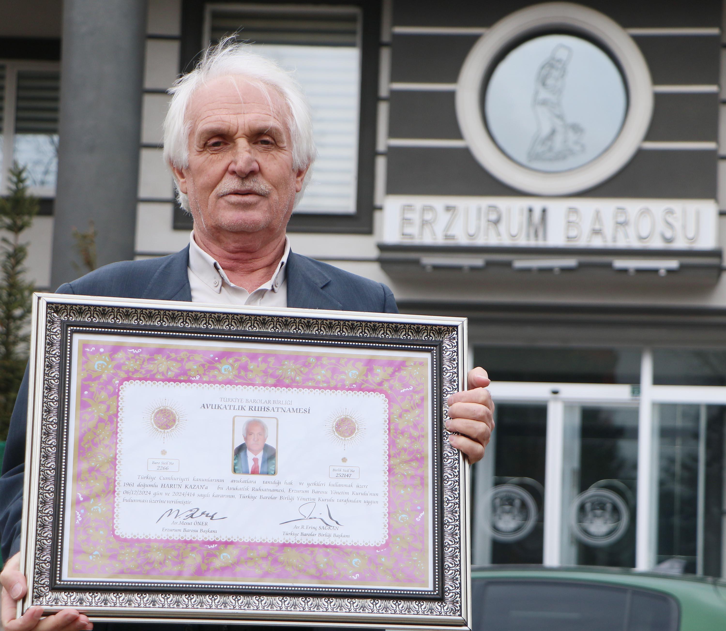 Turgay İPEK/ERZURUM, (DHA)- ERZURUM'da 30 yıl öğretmenlik yaptıktan sonra emekli olup girdiği üniversite sınavında çocukluk hayali Atatürk Üniversitesi Hukuk Fakültesi'ni kazanarak mezun olan evli, 4 çocuk ve 4 torun sahibi Harun Kazan (64), bir yıllık stajını da tamamlayıp ruhsatını alarak mesleğe ilk adımını attı.
