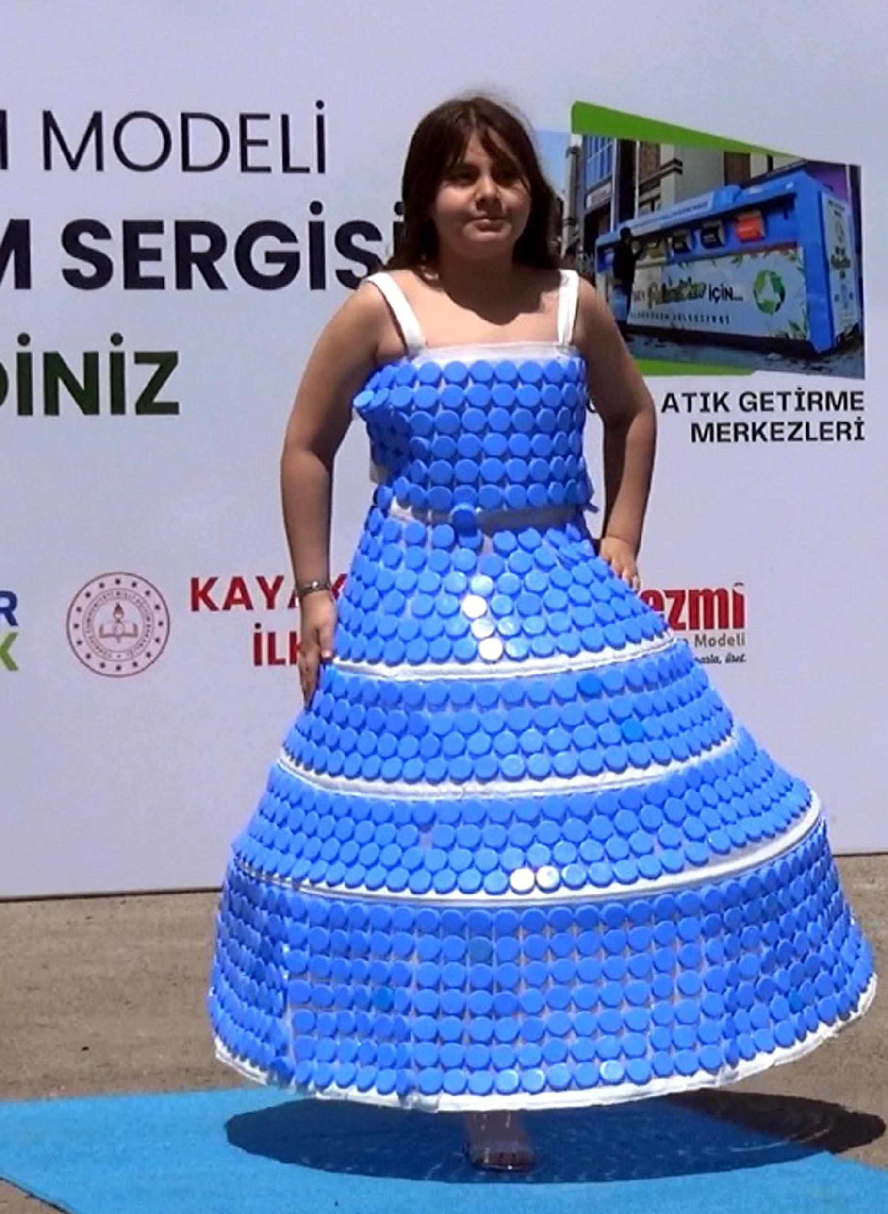 'Geri Dönüşüm ve Sıfır Atık' projesine katılan öğrenciler, topladıkları atıkları dönüştürdükleri elbiselerle defile sundu.1600 pet şişe kapağı kullanılarak elde edilen kıyafetin dikkat çektiği defilede öğrencilerin tasarımları beğeni topladı. Eski kıyafetleri ve kullanılmayan malzemeleri dönüştürerek birbirinden farklı kostümlerle defile sunan öğrenciler, yapay zekayla hazırladıkları şarkıyı da seslendirdi. Öğrenciler, defile sonrası geri dönüşüm malzemelerinden yaptıkları tasarımlardan oluşan sergide de davetlilere bilgiler verdi. (DHA)