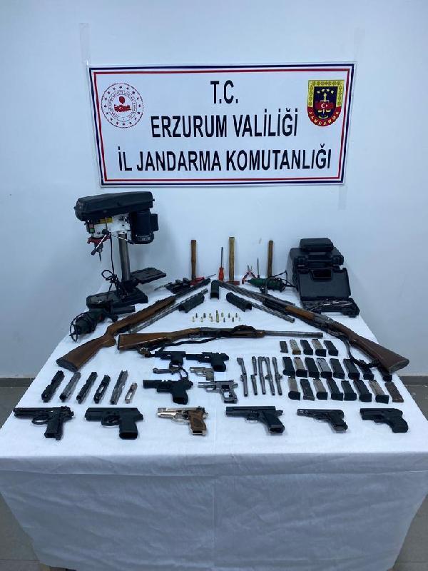 Erzurum Cumhuriyet Başsavcılığı koordinesinde, İl Jandarma Komutanlığı ekipleri, 16 Şubat günü Kazım Karabekir Mahallesinde kaçak silah ticareti ile silahların bakım ve tamiratının yapıldığı bir iş yerine baskın yaptı. 2 kişiyi suçüstü yakalayan jandarma, yaptığı aramada 5 adet el yapımı ruhsatsız seri numarası olmayan 9 milimetre çapında tabanca, 1 adet el yapımı ruhsatsız seri numarası olmayan 7,65 milimetre çapında tabanca, 3 adet markasız ve ruhsatsız seri numarası olmayan av tüfeği, 10 adet 9 milimetre çapında tabanca namlusu, 6 adet seri numarasız tabanca üst kapak takımı, 6 adet tabanca kabza ve gövdesi, 58 adet seri numarasız tabanca şarjörü ele geçirdi. Aramada ayrıca 1 adet freze makinesi, 2 adet matkap, 1 adet taşlama makinesi ile silah tamir, bakım ve yapımında kullanılan 154 adet iğne, 201 adet yay, 36 adet icra mili, 23 adet tetik, 78 adet pim bulundu. Suçüstü yakalanan 2 kişi İl Jandarma Komutanlığı'na götürüldü.