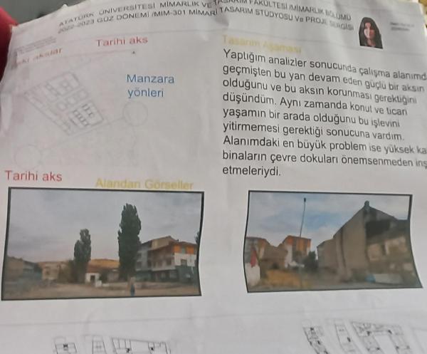 Salih TEKİN/ERZURUM, (DHA)- KAHRAMANMARAŞ merkezli depremde göçük altında kalıp, hayatını kaybeden Atatürk Üniversitesi Mimarlık ve Tasarım Fakültesi Mimarlık Bölümü 3'üncü sınıf öğrencisi Nazlı Huri Boz'un okuldaki son çalışması 'tarihi çevrede toplu konut' projesi oldu. Doç. Dr. Emriye Kazaz, öğrencisinin projesini saklayarak ailesine fahri diplomasıyla birlikte hatıra olarak vereceklerini bildirdi.