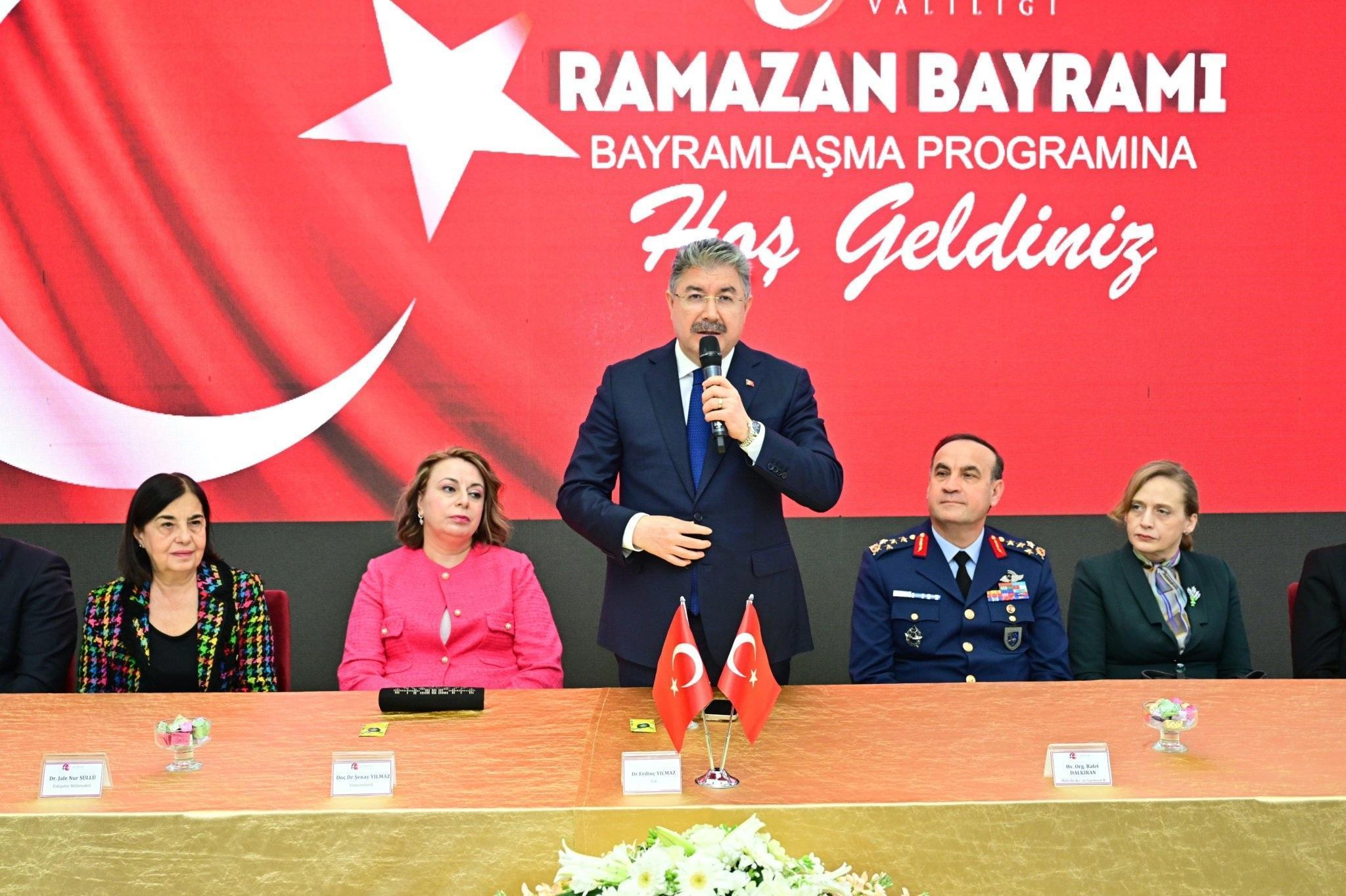 Eskişehir Valisi Erdinç Yılmaz, Ramazan Bayramı öncesinde düzenlenen bayramlaşma törenine katıldı. Devlet Su İşleri Sosyal Tesisi Sakarya Salonunda düzenlenen törene kent prrotokolü, siyasi parti temsilcileri, askeri erkan ve kamu ile kurum yöneticileri katıldı. Eskişehirlilerin Ramazan Bayramını kutlayan Vali Yılmaz, “Allah'a hamdolsun bugün Ramazan Bayramı'nın arife gününde bayramlaşmak için bir aradayız. Allah’ın bizi birlik, beraberlik, kardeşlik, huzur, sağlık içinde inşallah nice bayramlara kavuşturmasını diliyorum. Mübarek Ramazan Bayramı'nızı kutluyorum. Bayramlarımızda kırgınlıkların giderildiği, büyüklerimizin hatırlandığı, küçüklerimizin sevindirildiği ve bu güzel müstesna günlerde hamdolsun kardeşlik, birlik, beraberlik ruhunun en yüksekleri çıktığı günleri yaşıyoruz" dedi.