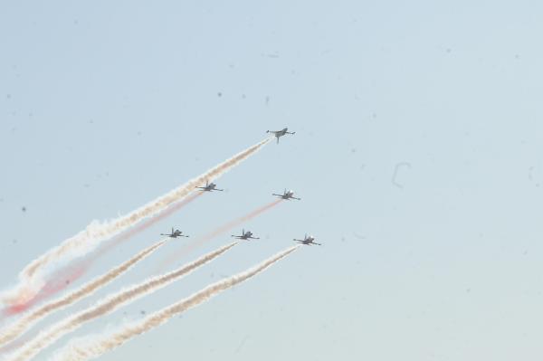 Eskişehir'de Sivrihisar Uluslararası Sportif Havacılık Merkezi’nce bu yıl 8’incisi düzenlenen hava gösterilerine Romanya’dan katılan ‘Romanya Şahinleri’ ekibi, gösteri uçuşu yaptı. Dörtlü ve solo olarak Eskişehir semalarında akrobasi gösterisi yapan ekibin şovları, büyük alkış topladı. İlk günün finalini ise Türk Hava Kuvvetleri’nin bağlı Türk Yıldızları ekibi yaptı. Eskişehir 1’inci Ana Jet Üssü’nden havalanan uçaklar, Sivrihisar semalarında birbirinden güç manevralarla izleyenlerin nefeslerini kesti. Havada kırmızı- beyaz şekiller çizen ekip, şehit ve gazi yakınları için de kalp şekli yaptı. Hava gösterilerini izleyenler ise Türk Yıldızları’nın gösterilerini cep telefonlarına kaydederek hayranlıkla izledi. (DHA)