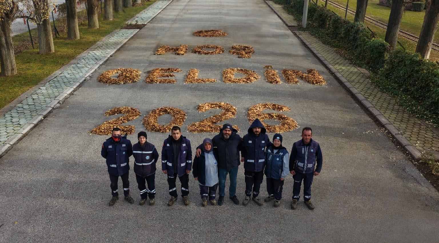 Temizlik işçileri, sonbahar yapraklarıyla ‘Hoş geldin 2026’ yazdı