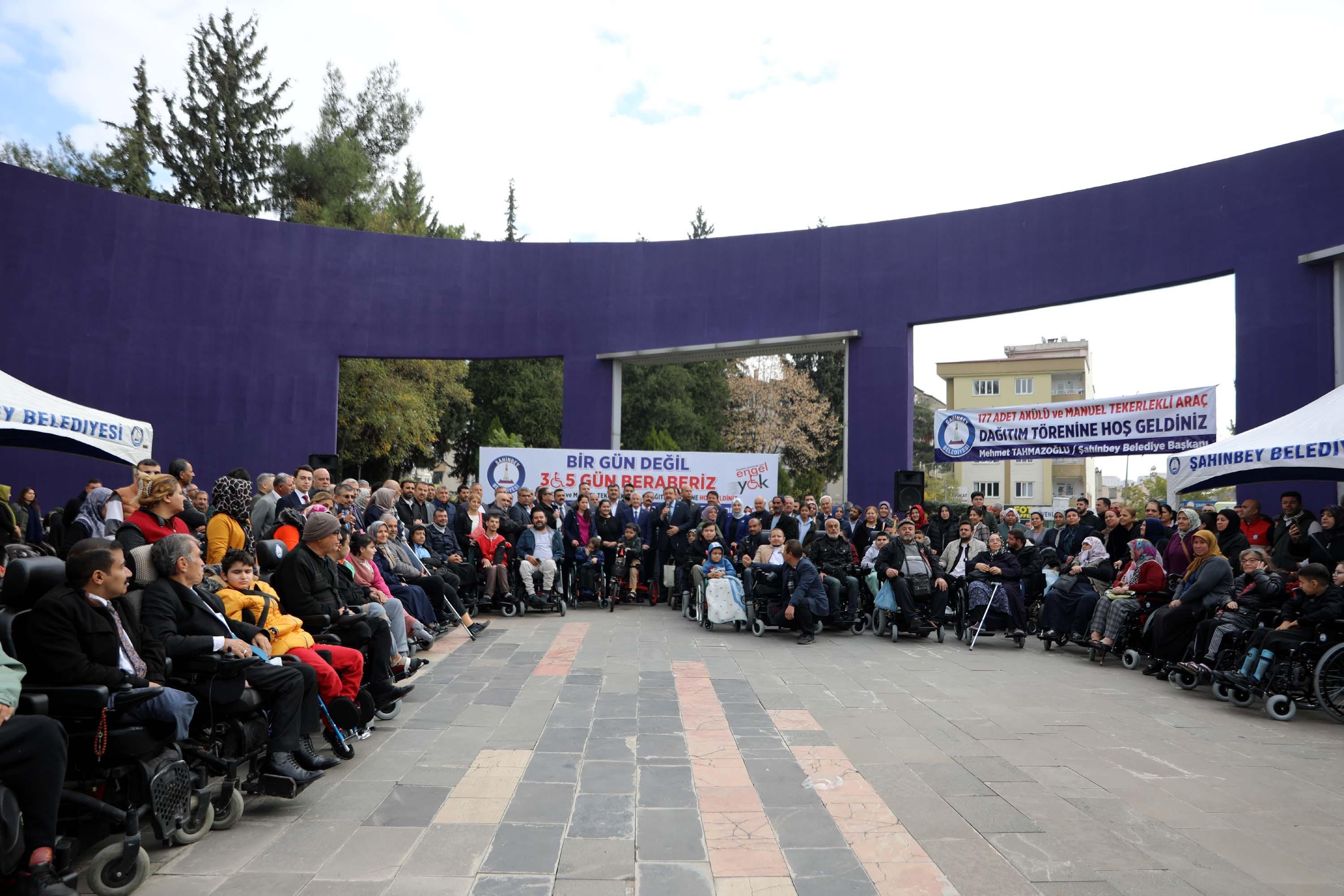 3 Aralık Dünya Engelliler günü kapsamında Şahinbey Belediyesi tarafından 127 engelli vatandaşa tekerlekli sandalye dağıtıldı. Dağıtım programında konuşan Şahinbey Belediye Başkanı Mehmet Tahmazoğlu, bugüne kadar 4 bin 581 akülü ve manuel tekerlekli sandalye dağıtımı yapıldığını söyleyerek, engelli vatandaşları hiçbir zaman unutmadıklarını ifade etti.