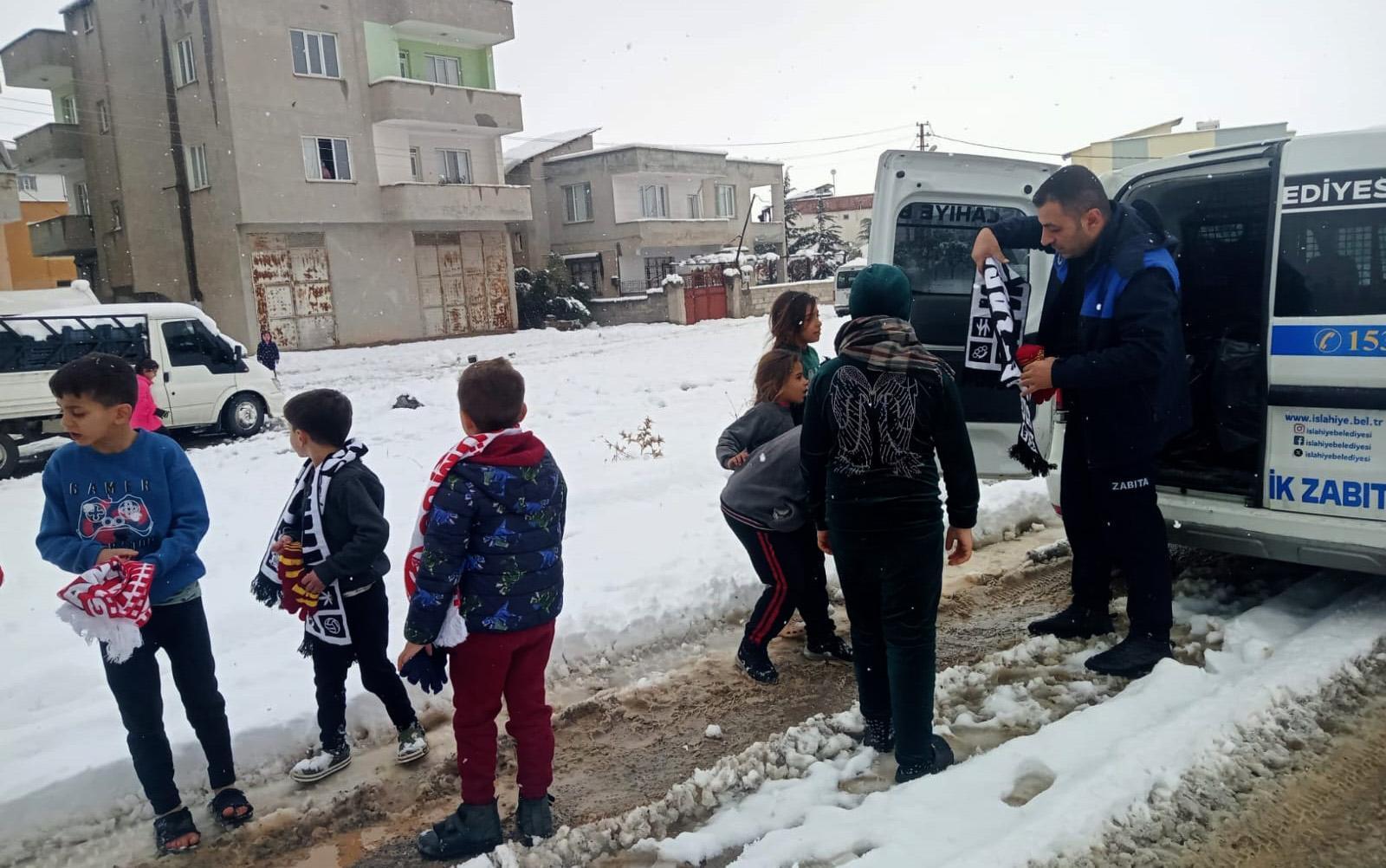Gaziantep’te kartopu oynayan çocuklara eldiven, bere ve atkı dağıtıldı