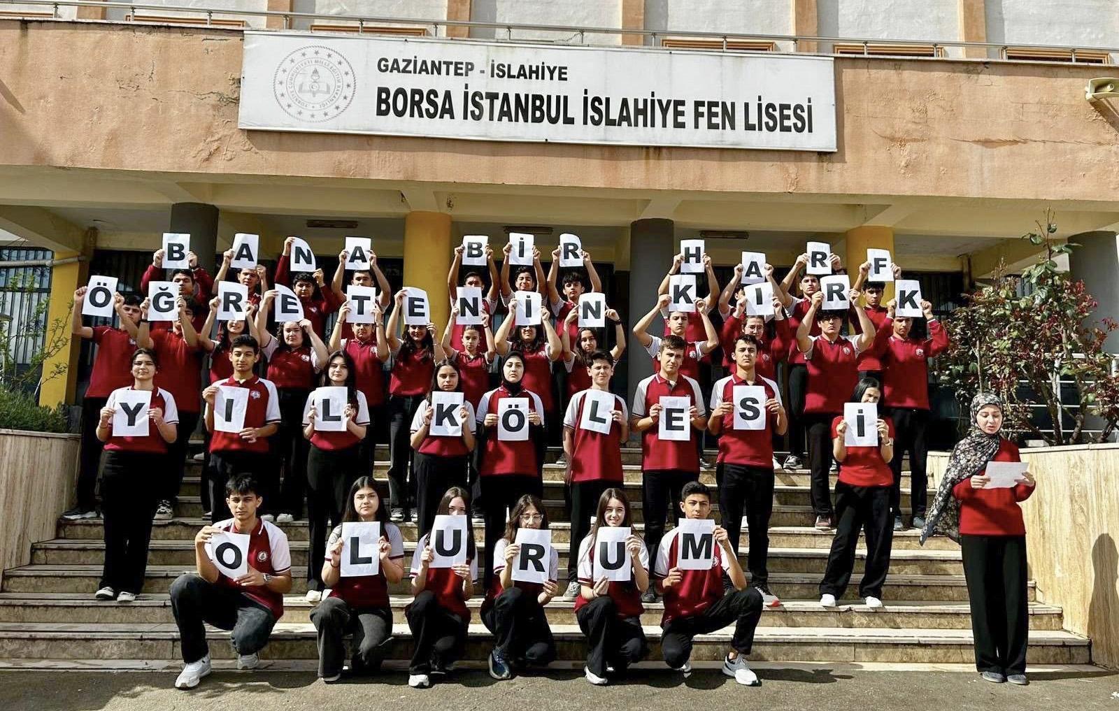 Kadir ÇELİK/GAZİANTEP, (DHA)- GAZİANTEP'in İslahiye ilçesindeki Borsa İstanbul Fen Lisesi’nde bir grup öğrenci ellerine aldıkları harflerle ‘Bana bir harf öğretenin kırk yıl kölesi olurum’ yazılı koreografi hazırladı.