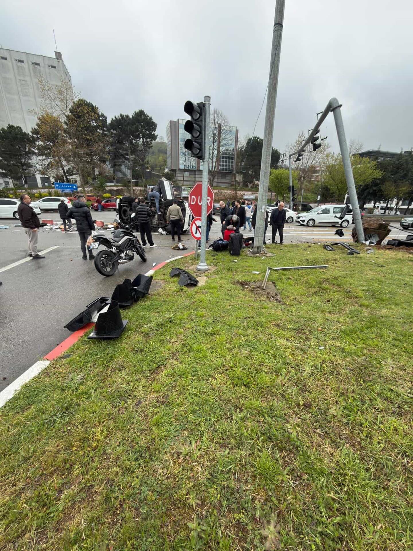 Öte yandan kaza anı yoldan geçen bir otomobilin araç kamerası tarafından görüntülendi. Görüntüde; kamyonetin sinyalizasyon direğine çarparak savrulduğu, yoldan geçen diğer sürücüler ile çevredeki vatandaşların, devrilen araçtaki yaralara yardım ettiği anlar yer aldı. (DHA)