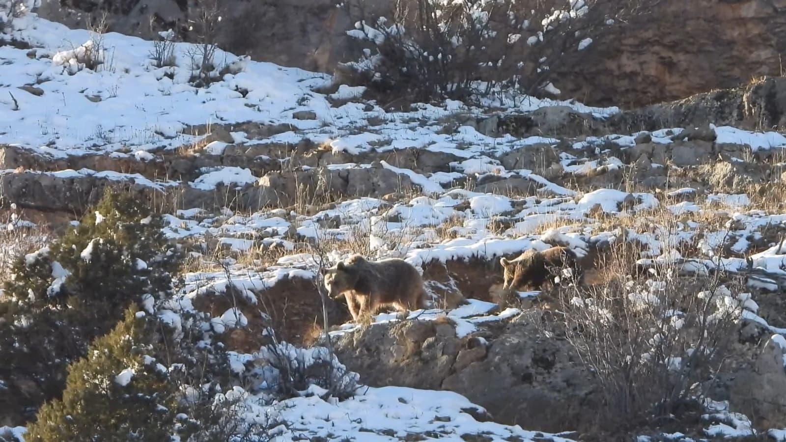 Kentin yüksek kesimlerinde etkili olan soğuk hava ve kar yağışı yaban hayatını olumsuz etkiledi. Karla kaplı yamaçta yiyecek arayan ayı ve yavrusu Doğa Koruma ve Milli Parklara ait yüksek çözünürlüklü kamerayla görüntülendi. Karla kaplı yamaçta yiyecek arayan ayı ve onu takip eden yavrusu kayıt altına alındı. Görüntüler Doğa Koruma ve Milli Parklar (DKMP) Genel Müdürlüğünün sanal medya hesaplarından, “Günün sorusu yaban hayatından geliyor! Bu anne ve yavrusunun karlar üzerindeki bu huzurlu ama şaşırtıcı yürüyüşü hakkında ne düşünüyorsunuz? A) Mevsimleri şaşırdılar, erken uyandılar. B) Bu kışı hiç uyumadan geçirdiler. Sizce hangisi?” sorusuyla paylaşıldı. (DHA)