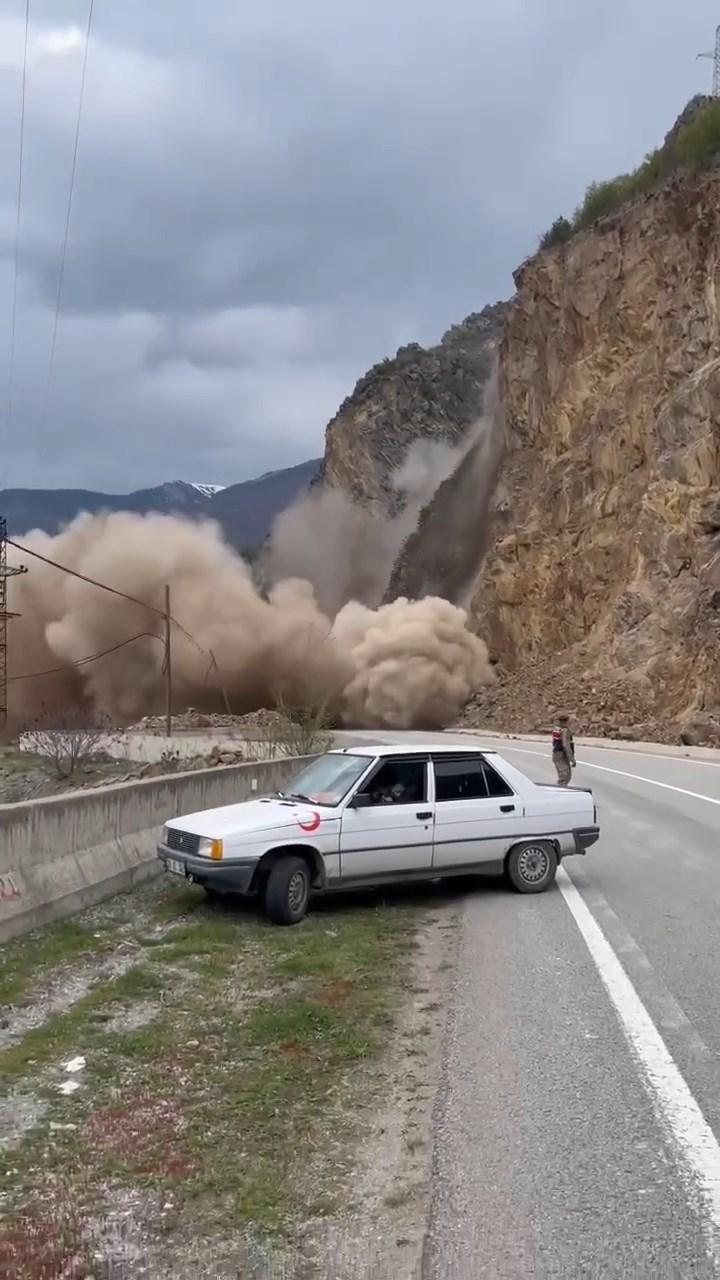 Selda FIRAT/KÜRTÜN (Gümüşhane), (DHA)- GÜMÜŞHANE’nin Kürtün ilçesinde yamaçtan kopan toprak ve irili ufaklı kaya parçaları nedeniyle karayolu ulaşıma kapandı. Yolda uzun araç kuyruğu oluşurken heyelan anı kameralara yansıdı.