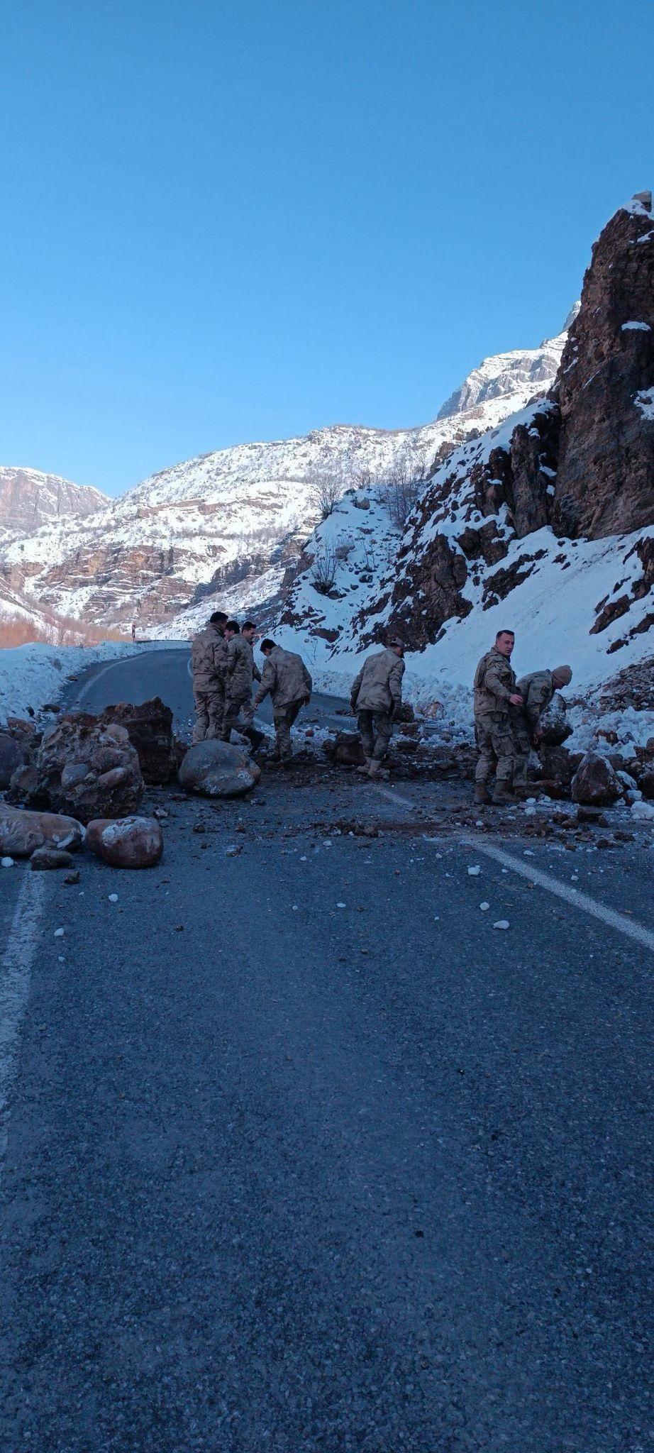 Kara yoluna düşen kaya parçaları askerler tarafından temizlendi