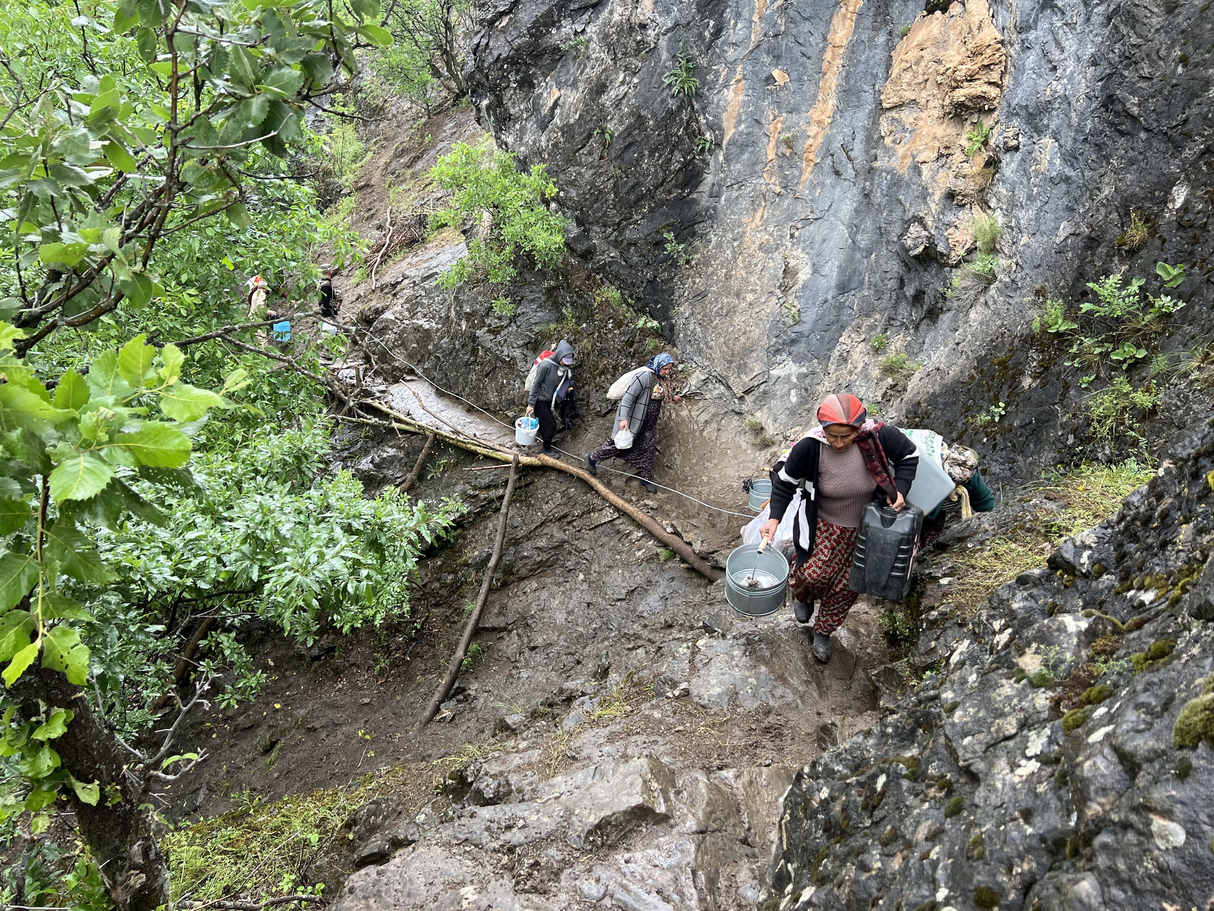 8 çocuk annesi Hanife Kartal (50), sabahın erken saatlerinde uyanıp yaylaya gittiklerini belirterek, "Her yıl bu zamanlarda yaylaya çıkıyoruz. Burada küçükbaşlarımızın süt sağımını yapıyoruz. Peynir, yoğurt, tereyağını yapıyoruz. Hem ev için yapıyoruz hem de süt ve ürünlerini satıp çocuklarımızın eğitim masraflarını ve ev ihtiyaçlarını karşılıyoruz. Her gün dağlık ve engebeli yolları geçip koyunlarımızı sağlamaya gidiyoruz. Zor ama yıllardır böyle. Koyunlarımızın bulunduğu alanda 500 metrelik yol engebeli olduğu için kendi imkanlarımızla odun, tahta parçaları ve elektrik telleriyle uçuruma düşmemek için patika yol yaptık. Tellere tutunarak zorlu kısmını tek sıra halinde geçiyoruz. Çok tehlikeli. En ufak bir harekette buradan dereye düşebiliriz. Dönüş yolculuğumuzda erkekler yardım ediyor. Zor bir yol ve yetkililerden bu yolun bu kısmının yapılmasını istiyoruz" dedi. (DHA)