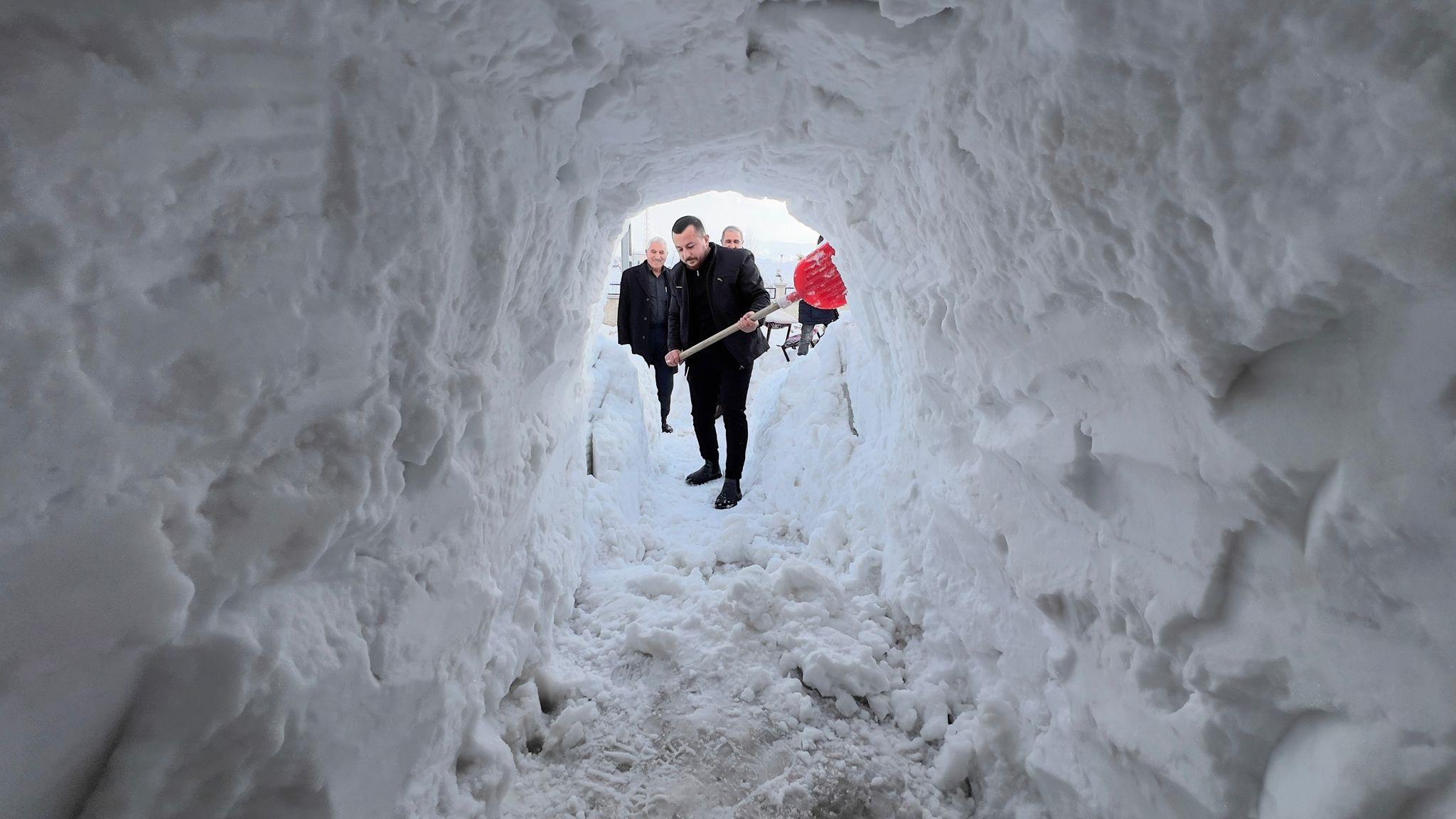Yüksekova'da esnaf dükkanının önüne kardan tünel açtı