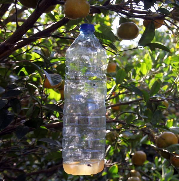Çilem Gökçe ÖĞÜT- İzzet NAZLI/ HATAY, (DHA)- HATAY’da, narenciye üreticilerinin korkulu rüyası olan Akdeniz meyvesi sineklerinden kurtulmak isteyen üreticiler, bahçelerinde ‘cazibe’ tuzakları uyguluyor. Pet şişenin içine çiftleşmek isteyen sineklerin salgıladığı kokuya benzer kimyasal koyularak, burada toplanmaları sağlanıyor.