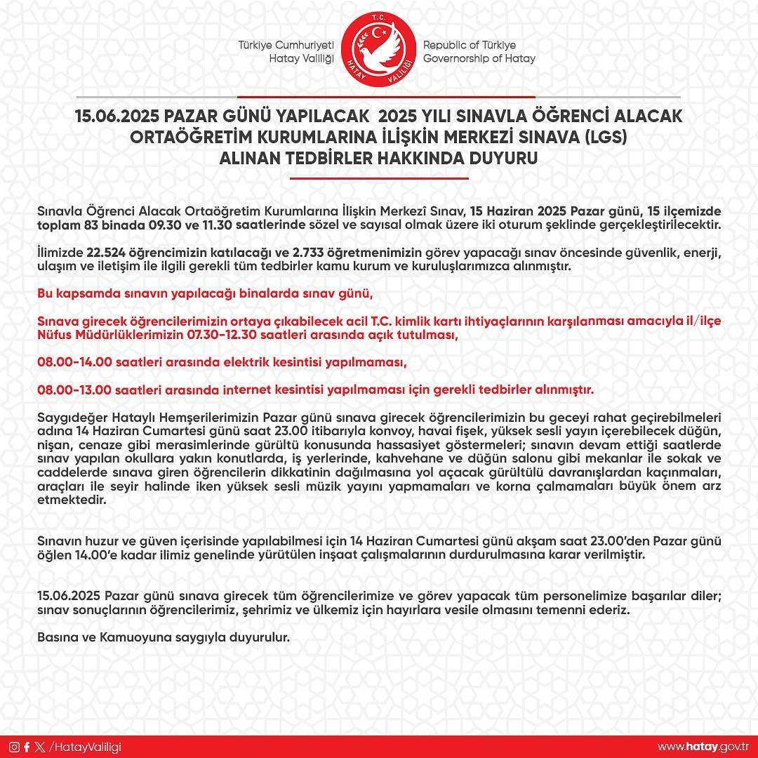 Valilikten yapılan duyuruda; “Sınavla Öğrenci Alacak Ortaöğretim Kurumlarına İlişkin Merkezi Sınav, 15 Haziran 2025 Pazar günü, 15 ilçemizde toplam 83 binada 09.30 ve 11.30 saatlerinde sözel ve sayısal olmak üzere iki oturum şeklinde gerçekleştirilecektir. İlimizde 22.524 öğrencimizin katılacağı ve 2 bin 733 öğretmenimizin görev yapacağı sınav öncesinde güvenlik, enerji, ulaşım ve iletişim ile ilgili gerekli tüm tedbirler kamu kurum ve kuruluşlarımızca alınmıştır. Bu kapsamda sınavın yapılacağı binalarda sınav günü, Sınava girecek öğrencilerimizin ortaya çıkabilecek acil kimlik kartı ihtiyaçlarının karşılanması amacıyla il/ilçe Nüfus Müdürlüklerimizin 07.30-12.30 saatleri arasında açık tutulması, 08.00-14.00 saatleri arasında elektrik kesintisi yapılmaması, 08.00-13.00 saatleri arasında internet kesintisi yapılmaması için gerekli tedbirler alınmıştır. Hataylı hemşerilerimizin pazar günü sınava girecek öğrencilerimizin bu geceyi rahat geçirebilmeleri adına 14 Haziran Cumartesi günü saat 23.00 itibarıyla konvoy, havai fişek, yüksek sesli yayın içerebilecek düğün, nişan, cenaze gibi merasimlerinde gürültü konusunda hassasiyet göstermeleri; sınavın devam ettiği saatlerde sınav yapılan okullara yakın konutlarda, iş yerlerinde, kahvehane ve düğün salonu gibi mekanlar ile sokak ve caddelerde sınava giren öğrencilerin dikkatinin dağılmasına yol açacak gürültülü davranışlardan kaçınmaları, araçları ile seyir halinde iken yüksek sesli müzik yayını yapmamaları ve korna çalmamaları büyük önem arz etmektedir. Sınavın huzur ve güven içerisinde yapılabilmesi için 14 Haziran Cumartesi günü akşam saat 23.00'den Pazar günü öğlen 14.00'e kadar ilimiz genelinde yürütülen inşaat çalışmalarının durdurulmasına karar verilmiştir. 15.06.2025 Pazar günü sınava girecek tüm öğrencilerimize ve görev yapacak tüm personelimize başarılar diler; sınav sonuçlarının öğrencilerimiz, şehrimiz ve ülkemiz için hayırlara vesile olmasını temenni ederiz” ifadelerine yer verildi. (DHA)