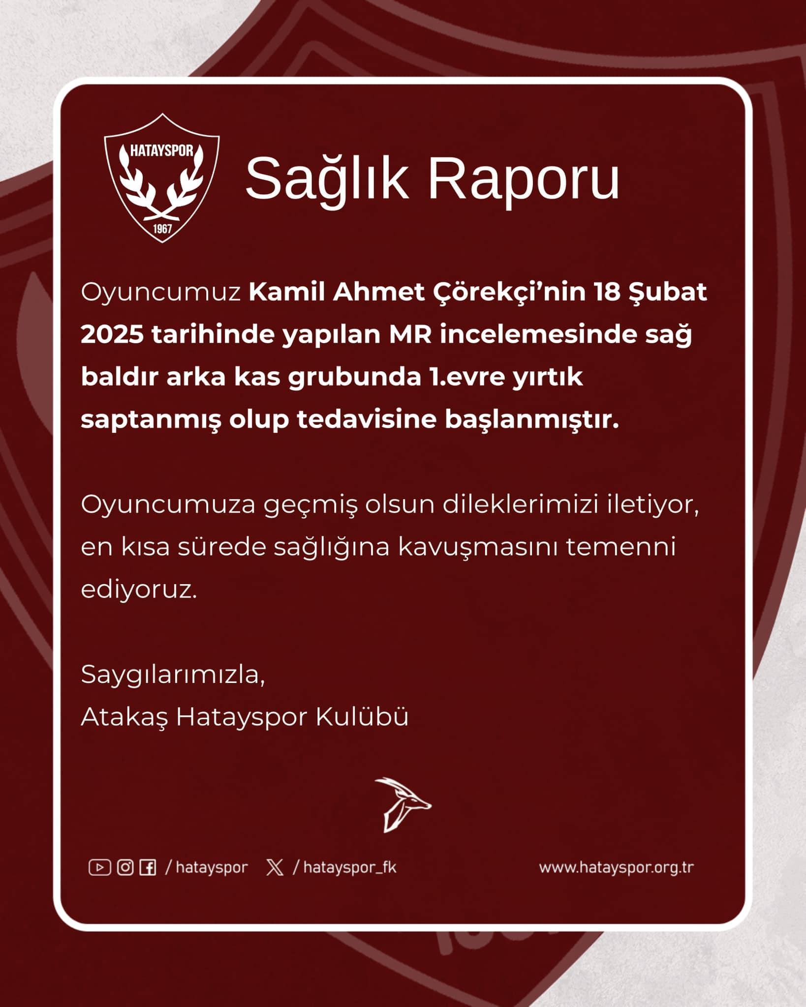 Samim SELÇUK/ HATAY, (DHA) – SÜPER Lig ekiplerinden Hatayspor’da takım kaptanı Kamil Ahmet Çörekçi’nin sağ baldır arka kas grubunda 1'inci evre yırtık tespit edildiği açıklandı.