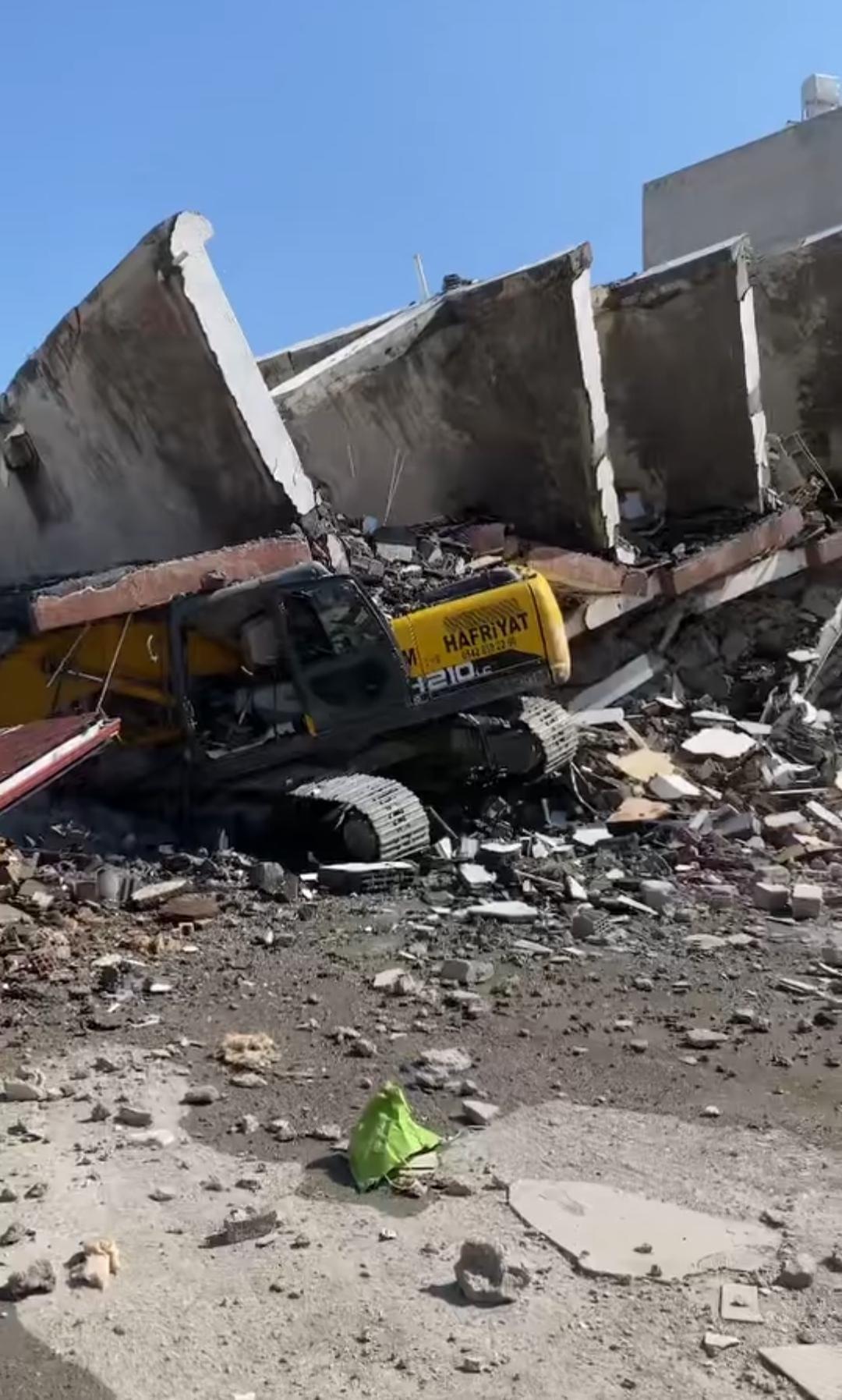 Hatay'da yıkım sırasında 7 katlı bina, iş makinesinin üzerine devrildi