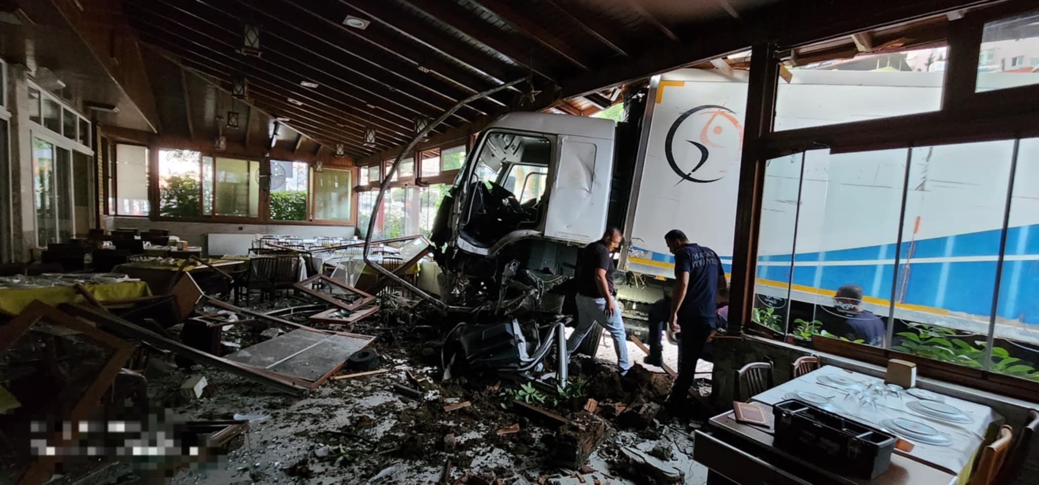 Freni boşalan kamyon, restorana girdi: kaza anı kamerada