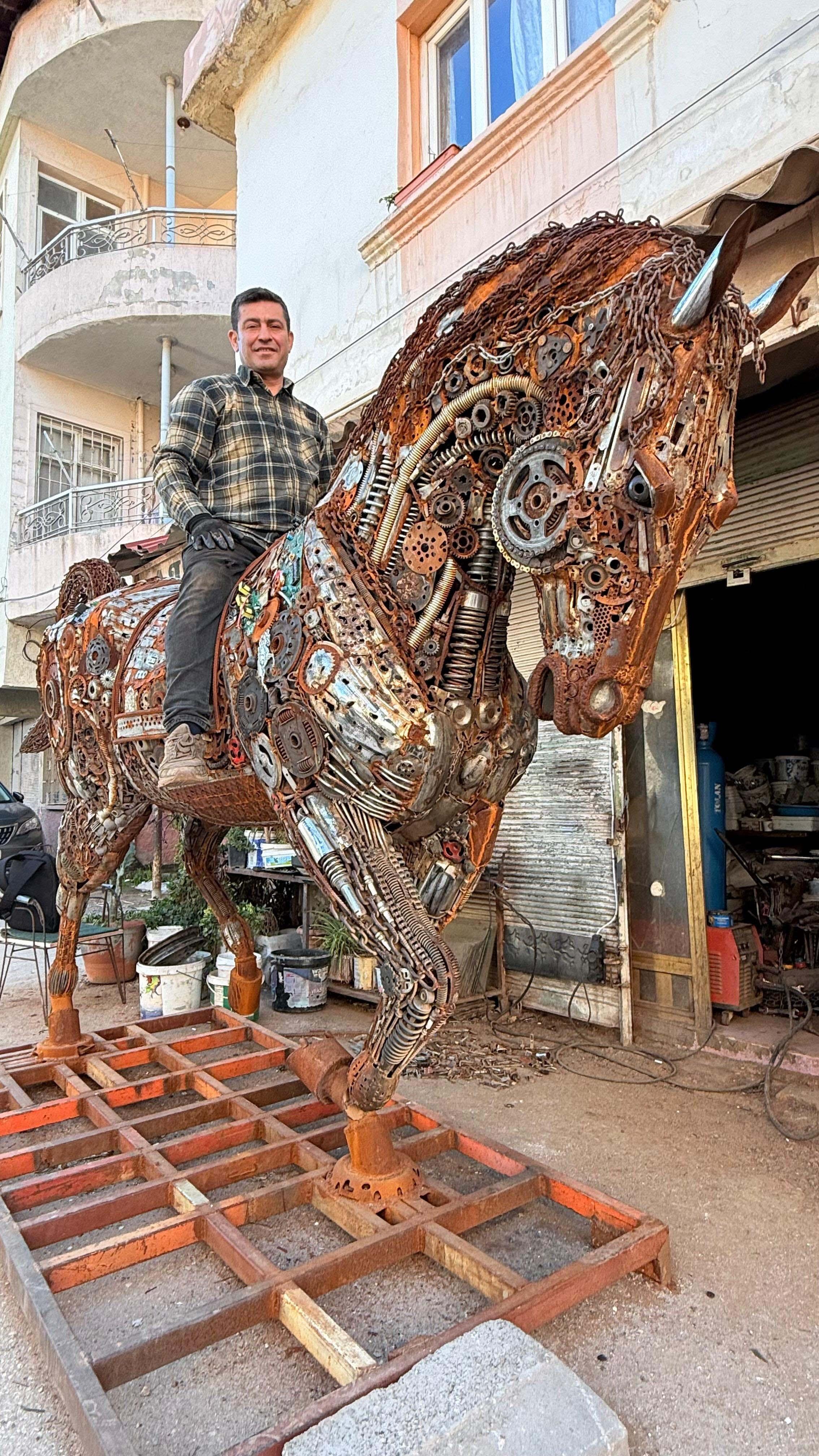Ferhat DERVİŞOĞLU/REYHANLI (Hatay), (DHA)- HATAY’da geri dönüşüm ve heykel sanatçısı Mervan Altınorak, metal ve elektronik atıklar kullanarak Büyük İskender’in mitolojideki efsanevi atı Bukefalos'un heykelini tasarladı. 2,5 ton ağırlığındaki heykel, Büyük İskender'in milattan önce 333 yılında Pers Kralı III. Darius'u yendiği İssos Savaşı'nın ardından o dönem Alexandreia adını vererek kurduğu İskenderun'da sergilenecek.