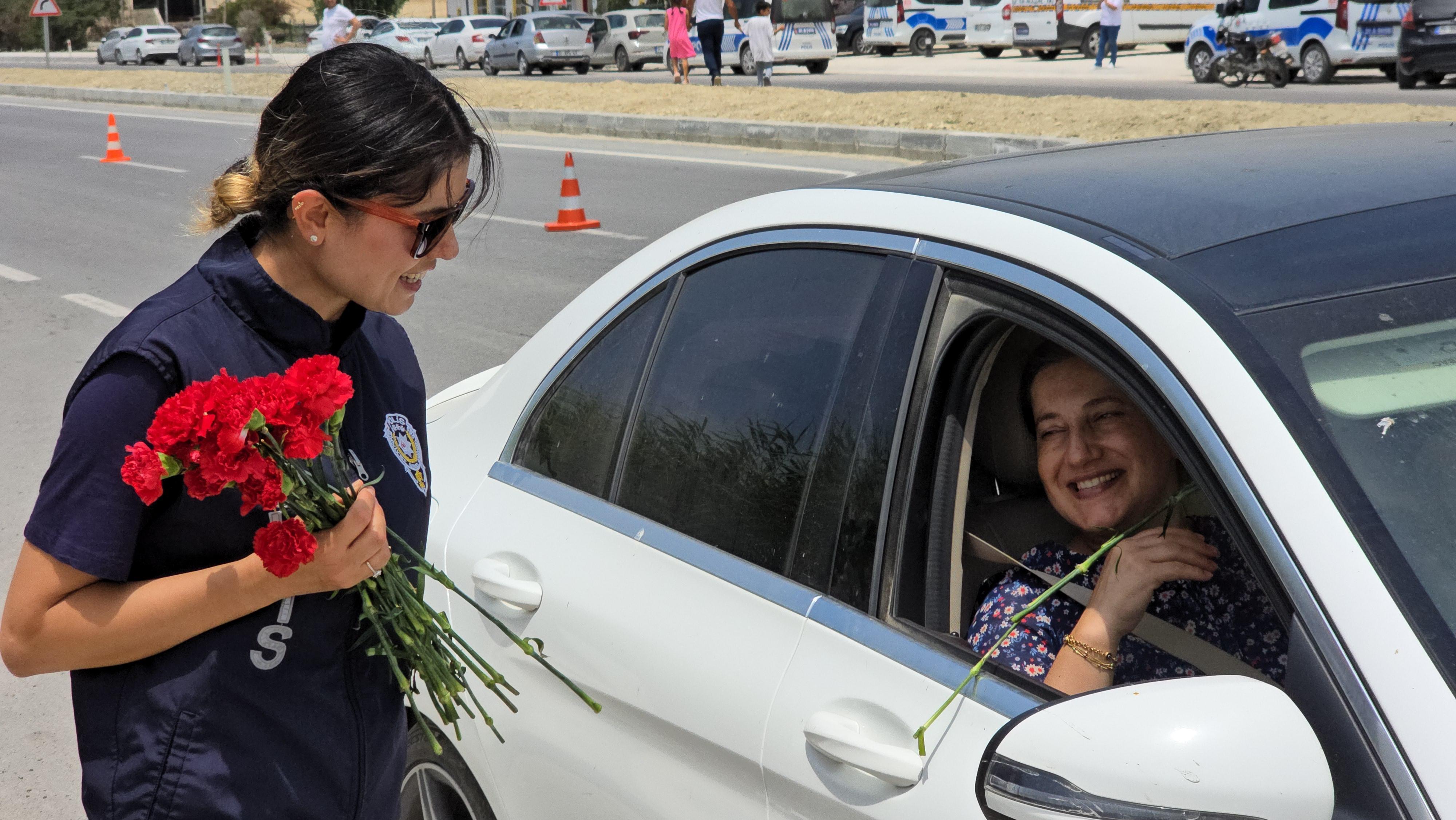 Alican GÜMÜŞ/HATAY, (DHA)-SAMANDAĞ İlçe Emniyet Müdürlüğü personeli, Gadir-i Hum Bayramı dolayısıyla trafikteki vatandaşlara çiçek verdi.