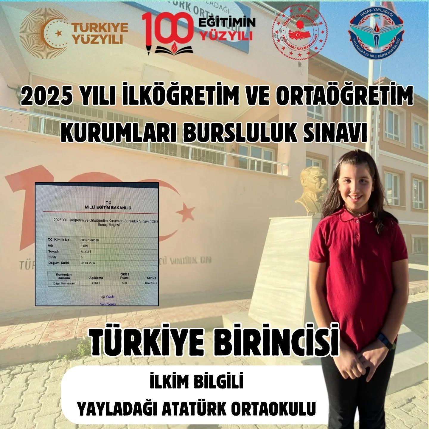 “Türkiye Birincisi Yayladağı'mızdan. Atatürk Ortaokulu 5. sınıf öğrencilerimizden İlkim Bilgili, 2025 yılı Bursluluk Sınavı’nda olağanüstü bir başarıya imza atarak tüm soruları doğru cevapladı ve 500 tam puan alarak Türkiye genelinde birinci oldu. Öğrencimizi yürekten tebrik ediyor, başarılarının artarak devam etmesini diliyoruz. Bu başarıda emeği olan başta okul idaremiz olmak üzere, öğrencimizin öğretmenlerini ve ailesini gönülden kutluyoruz.” (DHA)