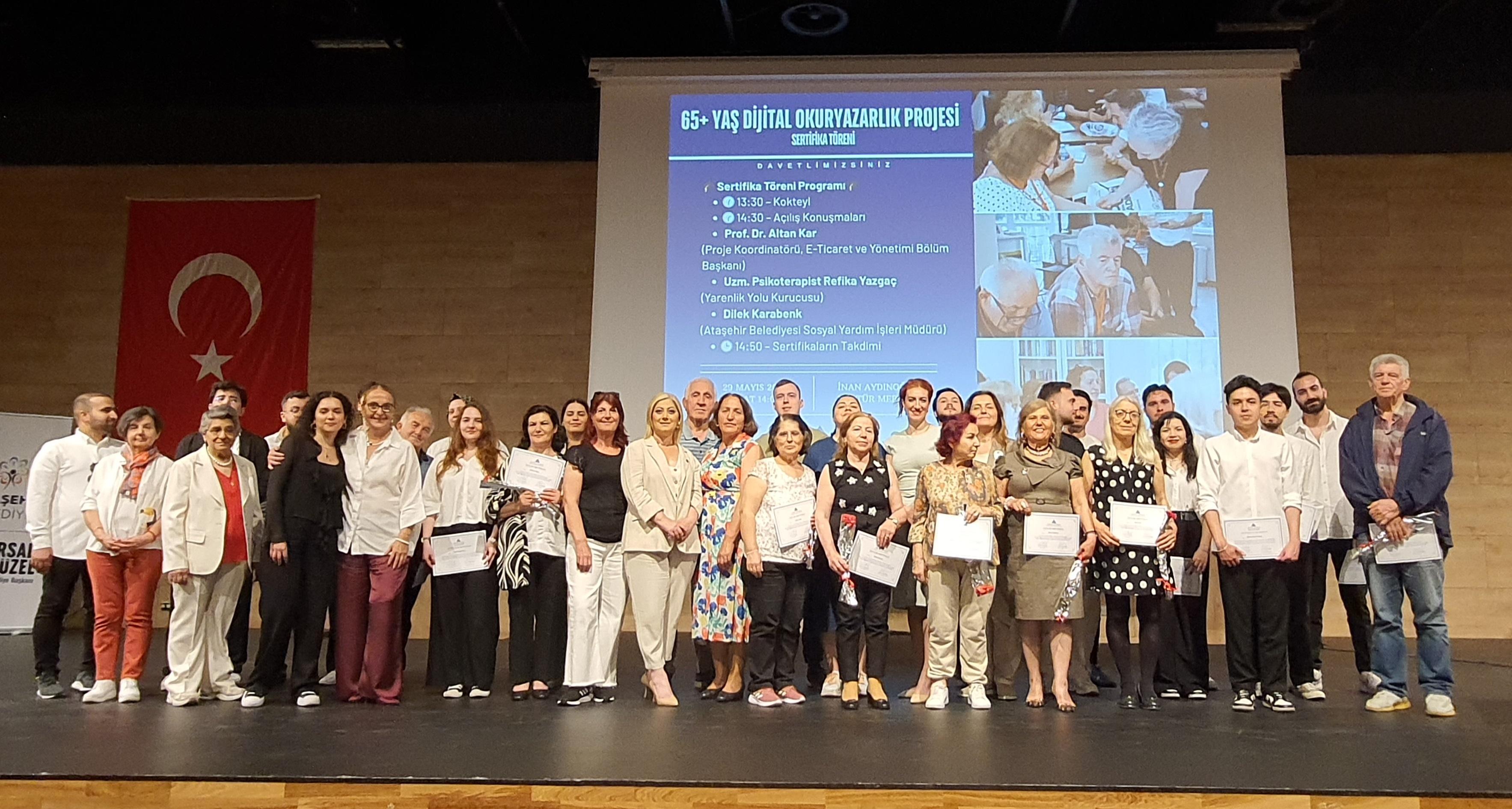 65-80 yaş arası katılımcılar; online bankacılıktan yemek tariflerine, e-devlet uygulamalarından sosyal medya kullanımına kadar pek çok konuda dijital beceri kazandıran dersleri, üniversite öğrencilerinden aldı. Dersleri başarıyla tamamlayan katılımcılar, düzenlenen törenle sertifikalarını aldı.
