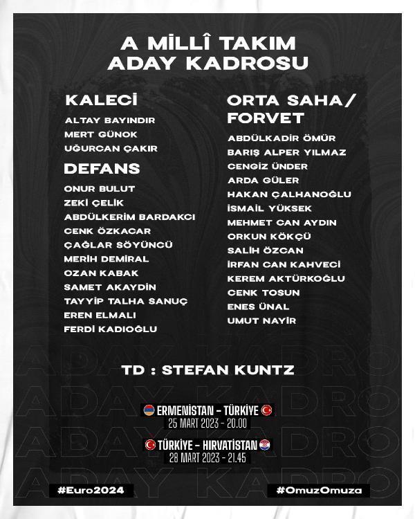 İSTANBUL,(DHA)- A Milli Futbol Takımı'nın UEFA EURO 2024 Elemeleri'nde 25 Mart'ta deplasmanda Ermenistan ve 28 Mart'ta Hırvatistan ile Bursa'da oynayacağı maçların aday kadrosu açıklandı.