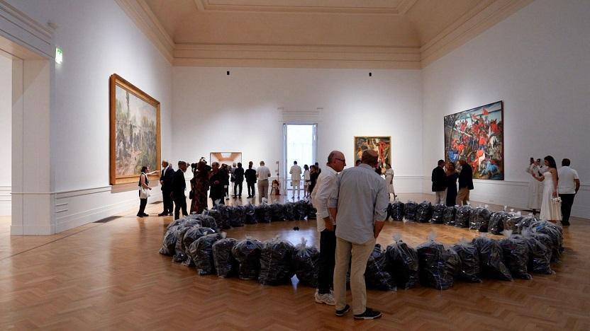 Serginin bir diğer yapıtı ise ‘Hafıza Tepesi’. Binlerce lastik ayakkabıyla oluşturulan bu anıtsal enstalasyon, klasik savaş tablolarının sergilendiği salonda yer alıyor. Eser, kolektif belleğin taşıyıcısı olarak geçmişin izlerini bugünün gözüyle yorumluyor.