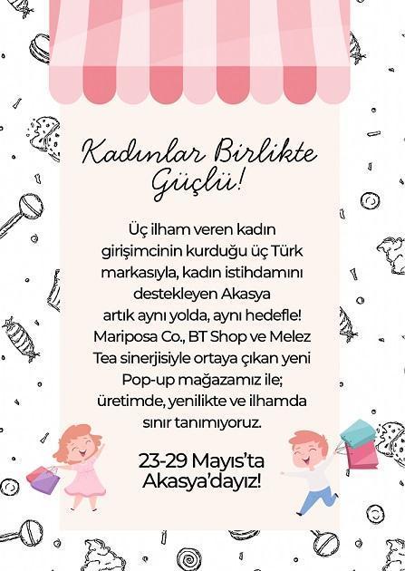 “Kadın girişimciliğini teşvik etmek amacıyla bir araya gelen Ece Sarıoğlu, Buse Terim ve Liliana Aslanoba, kendi markaları ile Akasya’da çok özel bir pop-up mağaza deneyimi yaratıyor. 23 Mayıs’ta kapılarını açacak bu alan, özenle seçilmiş bebek ve çocuk ürünleriyle, stil ve tasarımın öne çıktığı alternatif bir alışveriş deneyimi sunacak.