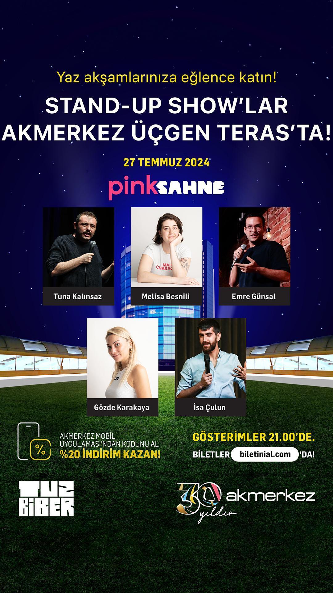 27 Temmuz akşamı, Pink Sahne'nin düzenlediği bu özel etkinlikte, Tuz Biber stand-up komedyenlerinden Tuna Kalınsaz, Melisa Besnili, Emre Günsal, Gözde Karakaya ve İsa Çulun kahkaha tufanı estirecek. Mizahın sevilen isimleri, seyircilere unutulmaz bir akşam yaşatmak için saat 21.00'da başlayacak performanslarıyla Üçgen Teras'ta olacak.