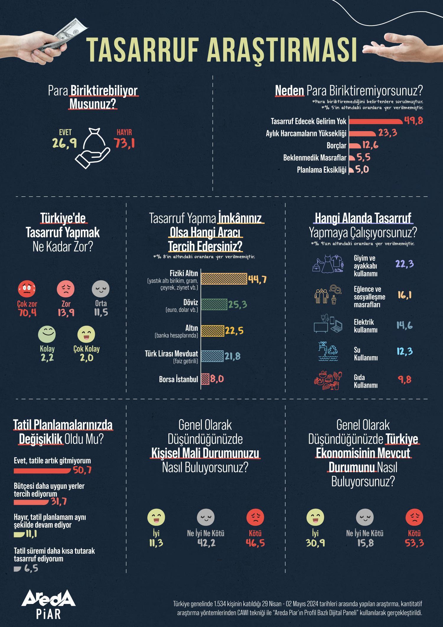 İSTANBUL,(DHA) - Areda Piar araştırma şirketinin Türkiye genelinde bin 534 kişinin katılımıyla gerçekleştirdiği araştırmaya göre, Türk halkının yüzde 73,1'i para biriktiremiyor ve yüzde 70,4'üne göre Türkiye'de tasarruf yapmak çok zor. Para biriktiremediğini belirtenlerin yüzde 49,8'i tasarruf edecek gelirinin olmadığını söyledi. Tasarruf yapma imkânı olsa yüzde 44,7'si fiziki altın (yastık altı birikim, altın, ziynet) ile yatırım yapmayı tercih edeceğini belirtti. En çok giyim, ayakkabı, eğlence ve sosyalleşme masraflarından kısılıyor. Yüzde 50,7'si tatile artık gitmediğini ifade ederken yüzde 31,7'si ise tatil için artık daha uygun yerleri tercih ediyor. Katılımcıların yüzde 46,5'i kişisel mali durumunun kötü olduğunu ifade ederken yüzde 53,3'ü ise Türkiye'nin mevcut ekonomik durumuna kötümser bakıyor.