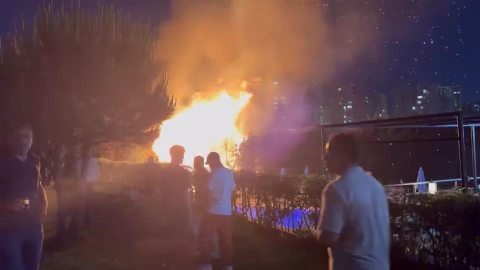 Yangın, saat 21.30 sıralarında Tahtakale Mahallesi Petunya Sokak'taki sitenin bahçesinde çıktı. İddiaya göre; sitedeki düğünde atılan havai fişekler nedeniyle parktaki ağaçlar alev aldı. Yangına müdahale eden çalışanlar, başarılı olamayınca itfaiye ekiplerine haber verildi. İhbar üzerine olay yerine gelen itfaiye ekipleri yangını kısa sürede söndürürken çıkış nedeniyle ilgili çalışma başlattı.