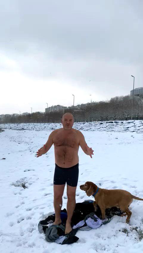 Avcılar'da 36 yıldır yaşayan Bekir Şen, kar yağışının İstanbul genelinde etkisini arttırmasının ardından soğuk havaya aldırış etmeden denize girdi. Köpeği Papi ile beraber denize giren Şen, o anları çevresindeki kişilere cep telefonuyla kaydettirdi.