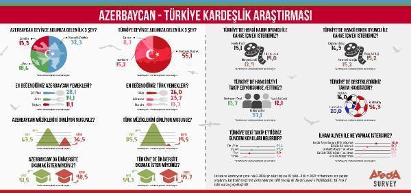 Araştırma, Türkiye ve Azerbaycan’da eşzamanlı olarak 2 bin 200 kişiyle yapıldı. Araştırma kapsamında Azerbaycan’da ‘Türkiye deyince aklınıza gelen ilk 3 şey’ nedir sorusu yöneltildi. Gelen cevaplar arasında ilk sırada yüzde 55,1 ile kardeşlik-dostluk yer aldı. İkinci sırada yüzde 15,2’si İstanbul, üçüncü olarak ise yüzde 8,7’lik bir oran ile şarkılar oldu. Türkiye’ye yöneltilen soruda da Türk halkının yüzde 32,3’ünün Azerbaycan denilince ilk olarak kardeşlik ve dostluk cevabını verdiği görüldü. İkinci sırada yüzde 18,6’sı Lehçe, üçüncü olarak ise yüzde 13,3’lük bir oran ile şarkılar oldu.
