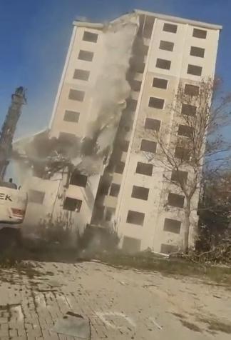 Site içerisindeki 10 katlı binanın yıkım çalışmaları sırasında aniden çöktüğü anlar olay anında 'bir şey yok' diyen vatandaş tarafından cep telefonu kamerasıyla kaydedildi. Görüntülerde, binanın aniden çökmesi ve bu sırada binanın yakınlarında bulunan çocukların enkazın altında kalmaktan son anda kurtulduğu anlar yer aldı. (DHA)