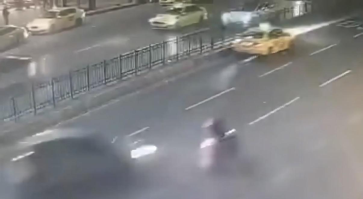 Şişhane’de otomobilin çarptığı motosiklet durağa daldı; kaza kamerada 1 ölü 3 yaralı