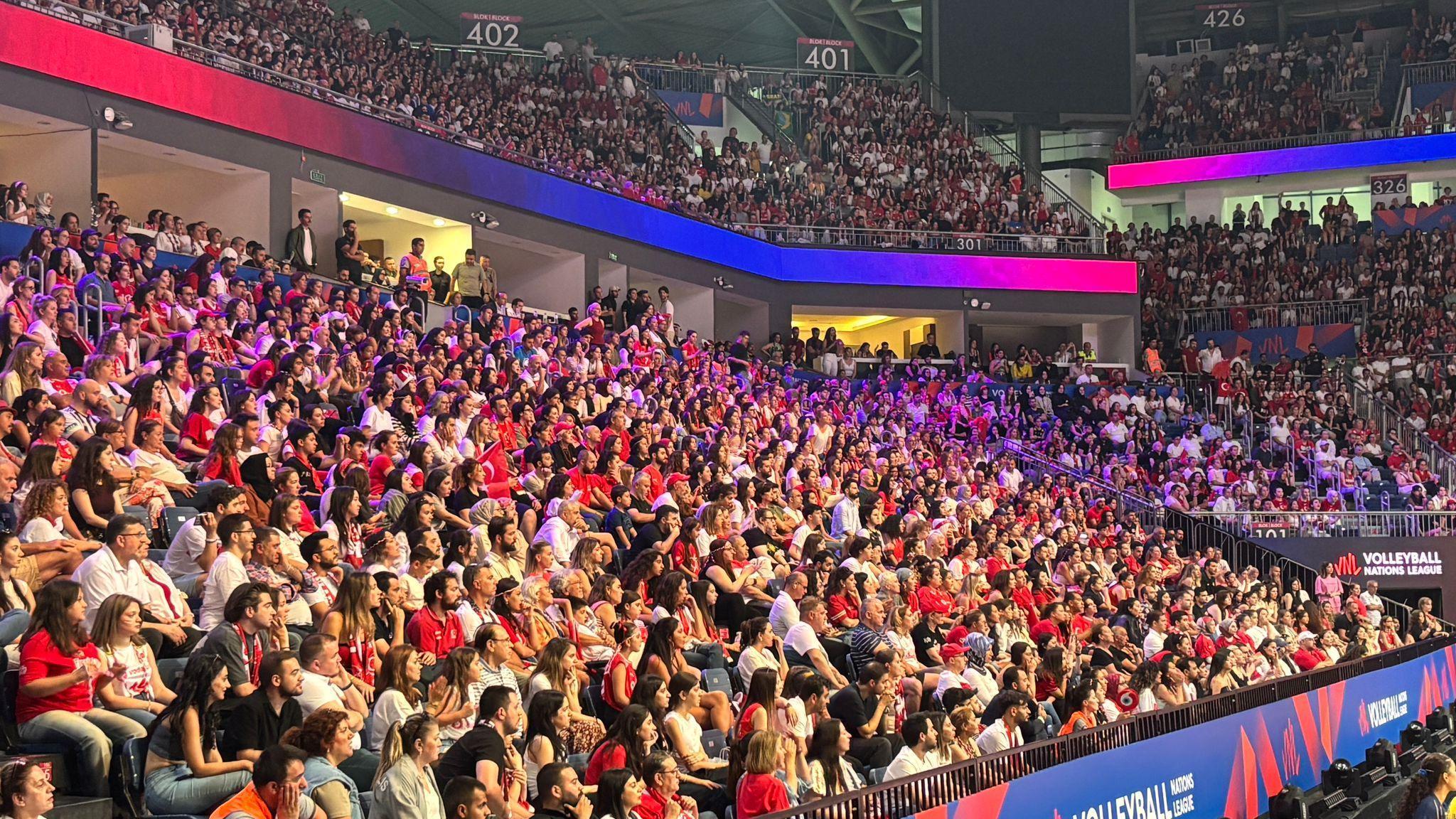 Mücadeleyi Gençlik ve Spor Bakanı Osman Aşkın Bak, İstanbul Valisi Davut Gül, Fenerbahçe Başkanı Ali Koç ve Türkiye Voleybol Federasyonu Başkanı Mehmet Akif Üstündağ protokolden izlerken 17.034 seyirci ile Milletler Ligi (VNL) seyirci rekoru tekrar kırıldı.