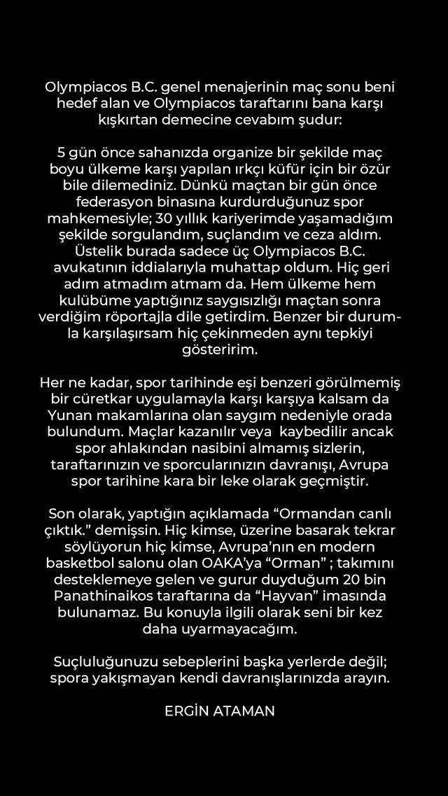 “Olympiacos B.C. genel menajerinin maç sonu beni hedef alan ve Olympiacos taraftarını bana karşı kışkırtan demecine cevabım şudur: