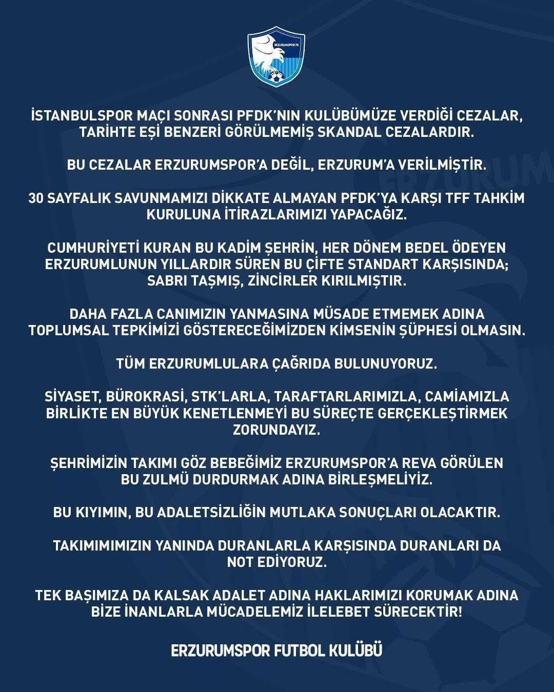İSTANBUL, (DHA)- 19 Nisan da oynanan ve İstanbulspor'un deplasmanda 2-1 kazandığı maçın ardından soyunma odasına giden koridorda olaylar çıktı. Erzurumspor Profesyonel Futbol Disiplin Kurulu'na (PFDK) sevk edilip ceza yağmuruna maruz kalırken İstanbulspor'un disiplin kuruluna dahi sevk edilmemesi Erzurumspor'u çileden çıkardı. Erzurumspor cephesi bu cezaları hak etmediklerini belirtip savunma hazırladı. 30 sayfalık raporun dikkate alınmadığını belirten Erzurumsporlu yöneticiler Türkiye Futbol Federasyonu (TFF) Tahkim Kurulu'na başvuracaklarını söyleyerek şu açıklamayı yaptı; " İstanbulspor maçı sonrası PFDK'nın kulübümüze verdiği cezalar, tarihte eşi benzeri görülmemiş skandal cezalardır. Bu cezalar Erzurumspor'a değil, Erzurum'a verilmiştir. 30 sayfalık savunmamızı dikkate almayan PFDK'ya karşı TFF Tahkim Kurulu'na itirazlarımızı yapacağız. Cumhuriyeti kuran bu kadim şehrin, her dönem bedel ödeyen Erzurumlunun yıllardır süren bu çift standart karşısında; sabrı taşmış, zincirler kırılmıştır. Daha fazla canımızın yanmasına müsaade etmemek adına toplumsal tepkimizi göstereceğimizden kimsenin şüphesi olmasın. Tüm Erzurumlulara çağrıda bulunuyoruz. Siyaset, Bürokrasi, STK'larla, taraftarımızla, camiamızla birlikte en büyük kenetlenmeyi bu süreçte gerçekleştirmek zorundayız. Şehrimizin takımı göz bebeğimiz Erzurumspor'a reva görülen bu zulmü durdurmak adına birleşmeliyiz. Bu kıyımın, bu adaletsizliğin mutlaka sonuçları olacaktır. Takımımızın yanında duranlarla karşısında duranları da not ediyoruz. Tek başımıza da kalsak adalet haklarımızı korumak adına bize inanlarla mücadelemiz ilelebet sürecektir."