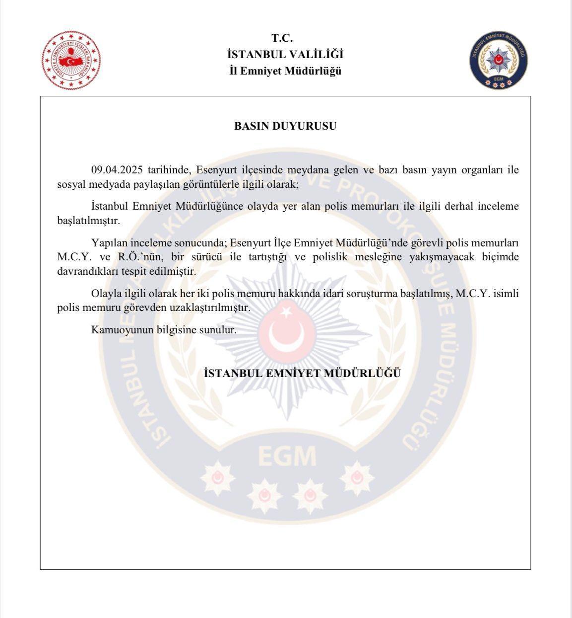 Olaya ilişkin İstanbul Emniyet Müdürlüğü sosyal medyadan açıklama yayınladı. Açıklamada, "Esenyurt ilçesinde meydana gelen ve bazı basın yayın organları ile sosyal medyada paylaşılan görüntülerle ilgili olarak; İstanbul Emniyet Müdürlüğünce olayda yer alan polis memurları ile ilgili derhal inceleme başlatılmıştır. Yapılan inceleme sonucunda; Esenyurt İlçe Emniyet Müdürlüğü'nde görevli polis memurları M.C.Y. ve R.Ö.'nün, bir sürücü ile tartıştığı ve polislik mesleğine yakışmayacak biçimde davrandıkları tespit edilmiştir. Olayla ilgili olarak her iki polis memuru hakkında idari soruşturma başlatılmış, M.C.Y. isimli polis memuru görevden uzaklaştırılmıştır." ifadeleri kullanıldı. (DHA)