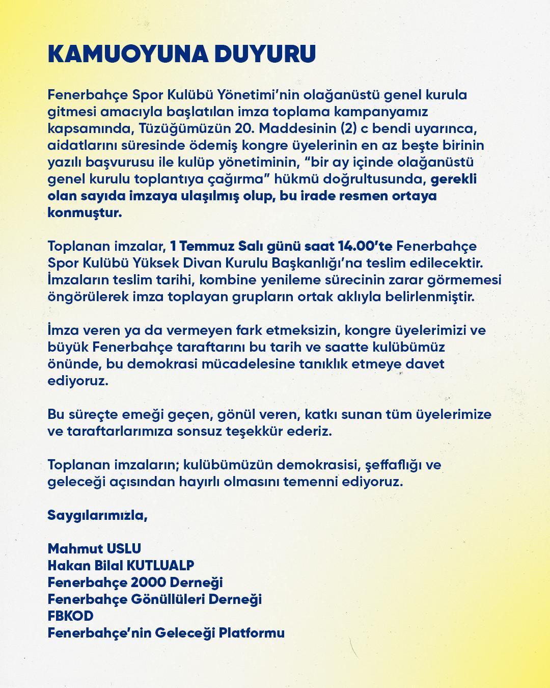 "Fenerbahçe Spor Kulübü Yönetimi'nin olağanüstü genel kurula gitmesi amacıyla başlatılan imza toplama kampanyamız kapsamında, Tüzüğümüzün 20. Maddesinin (2) c bendi uyarınca aidatlarını süresinde ödemiş kongre üyelerinin en az beşte birinin yazılı başvurusu ile kulüp yönetiminin, "bir ay içinde olağanüstü genel kurulu toplantıya çağırma" hükmü doğrultusunda, gerekli olan sayıda imzaya ulaşılmış olup, bu irade resmen ortaya konmuştur.