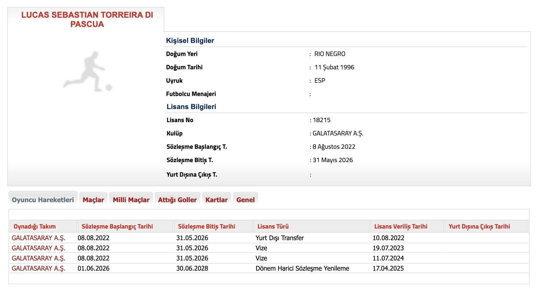Sarı-kırmızılı ekip, 29 yaşındaki Uruguaylı futbolcusu Lucas Torreira'nın 2026'da bitecek sözleşmesinin 2028 yılına kadar uzatıldığını TFF'ye bildirdi. 2022/23 sezonundan bu yana sarı-kırmızılı formayı terleten Torreira, Galatasaray formasıyla 123 maça çıkarken, 4 gol 8 asiste imza attı.