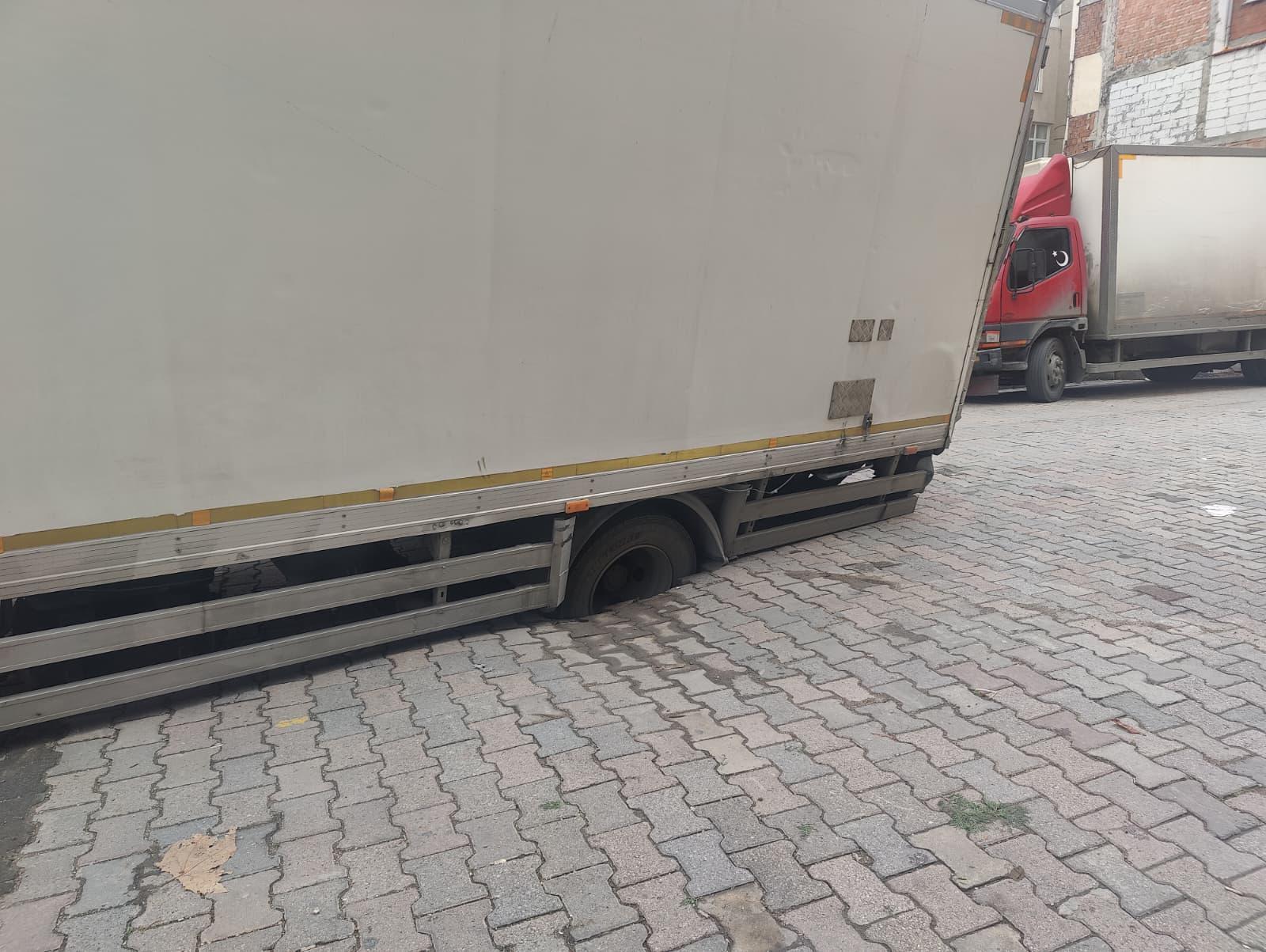 İstanbul- Güngören’de yol çöktü; kamyonunun tekeri çukura saplandı