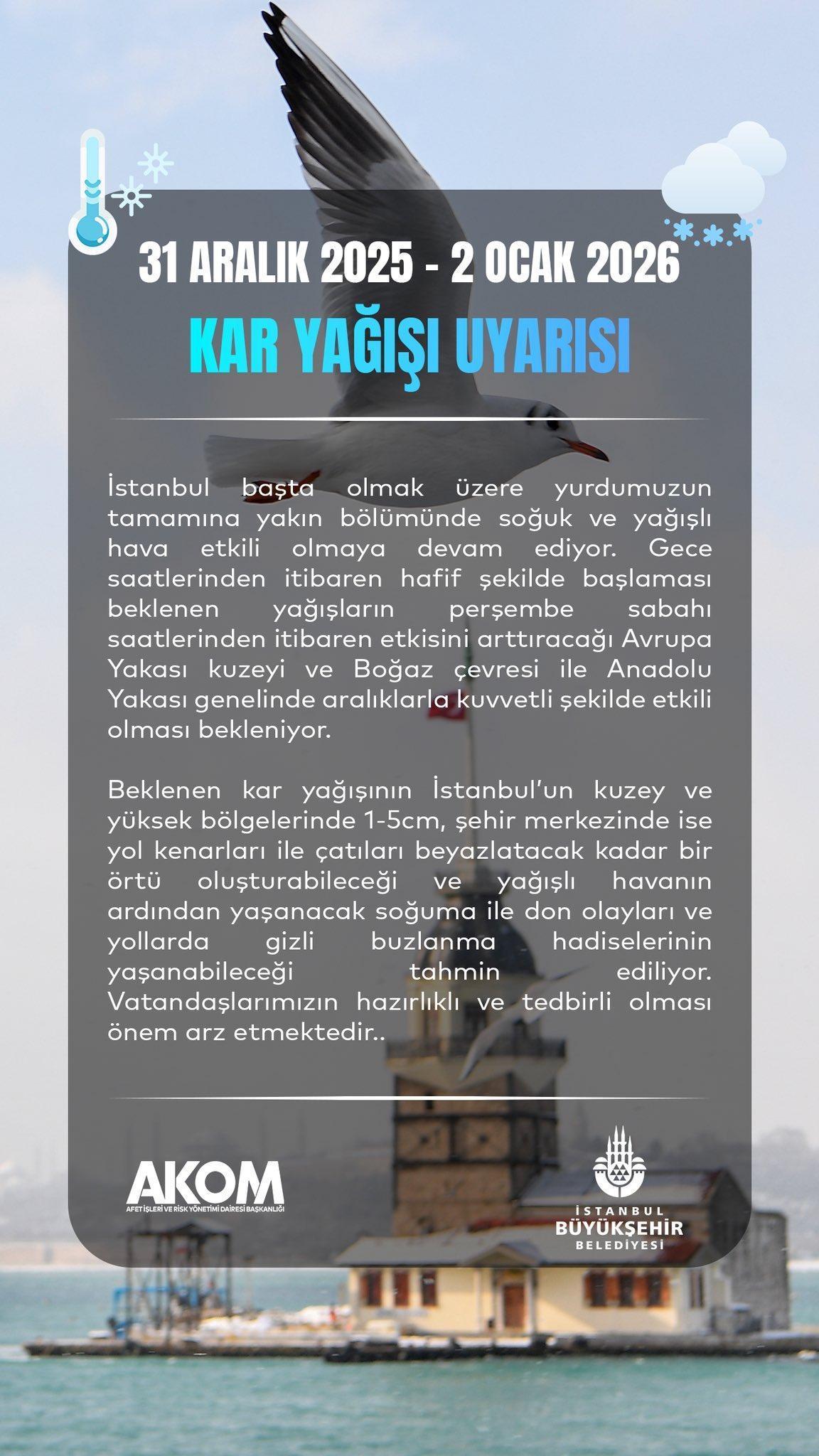 İSTANBUL,(DHA) - İSTANBUL Büyükşehir Belediyesi (İBB) AKOM tarafından İstanbul için kar yağışı uyarısı yayınlandı.