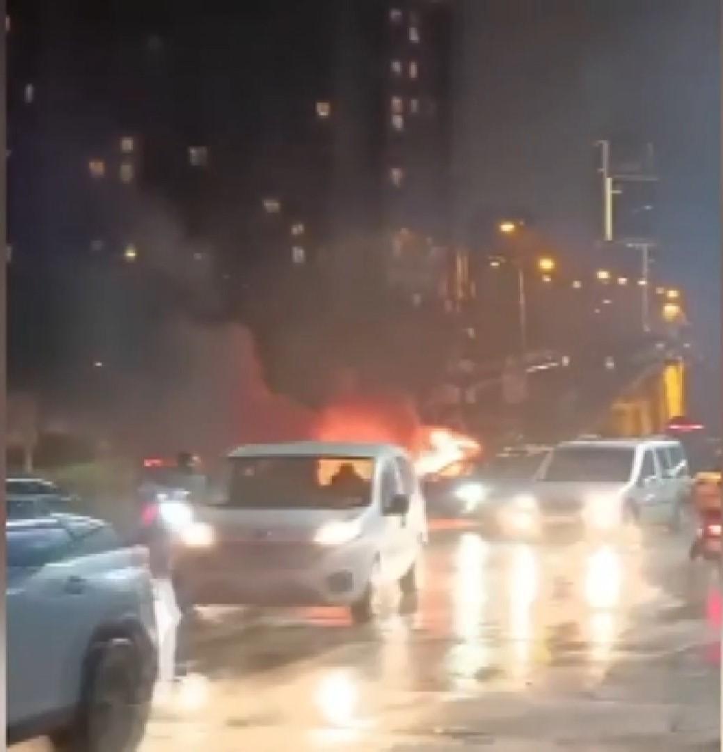 Yangın, saat 20.04 sıralarında Barbaros Mahallesi Ihlamur Bulvarı'nda meydana geldi. Seyir halindeyken henüz bilinmeyen bir nedenle alev alan 34 AZ 1801 plakalı otomobilin sürücüsü aracından son anda inerek yanmaktan kurtuldu. Sürücüsü indikten sonra yokuş aşağı kaymaya başlayan otomobil, trafikteki araçların arasından geçerek yol kenarındaki reklam tabelasına çarparak durabildi. Trafikteki araçların sürücüleri yanan otomobile çarpmamak için zor anlar yaşarken ihbar üzerine olay yerine itfaiye, sağlık ve polis ekipleri sevk edildi. Kısa sürede söndürülen otomobil kullanılmaz hale gelirken o anlar çevredekilerin cep telefonu kamerasıyla kaydedildi. (DHA)