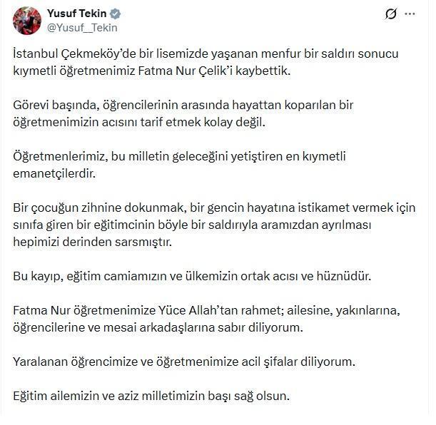 Bakan Yusuf Tekin, sosyal medya hesabından yaptığı paylaşımda, “İstanbul Çekmeköy’de bir lisemizde yaşanan menfur bir saldırı sonucu kıymetli öğretmenimiz Fatma Nur Çelik’i kaybettik. Görevi başında, öğrencilerinin arasında hayattan koparılan bir öğretmenimizin acısını tarif etmek kolay değil. Öğretmenlerimiz, bu milletin geleceğini yetiştiren en kıymetli emanetçilerdir. Bu kayıp, eğitim camiamızın ve ülkemizin ortak acısıdır. Fatma Nur öğretmenimize Allah’tan rahmet; ailesine, yakınlarına, öğrencilerine ve mesai arkadaşlarına sabır diliyorum. Yaralanan öğretmenimiz ve öğrencimize acil şifalar diliyorum. Eğitim ailemizin ve aziz milletimizin başı sağ olsun" ifadelerini kullandı.