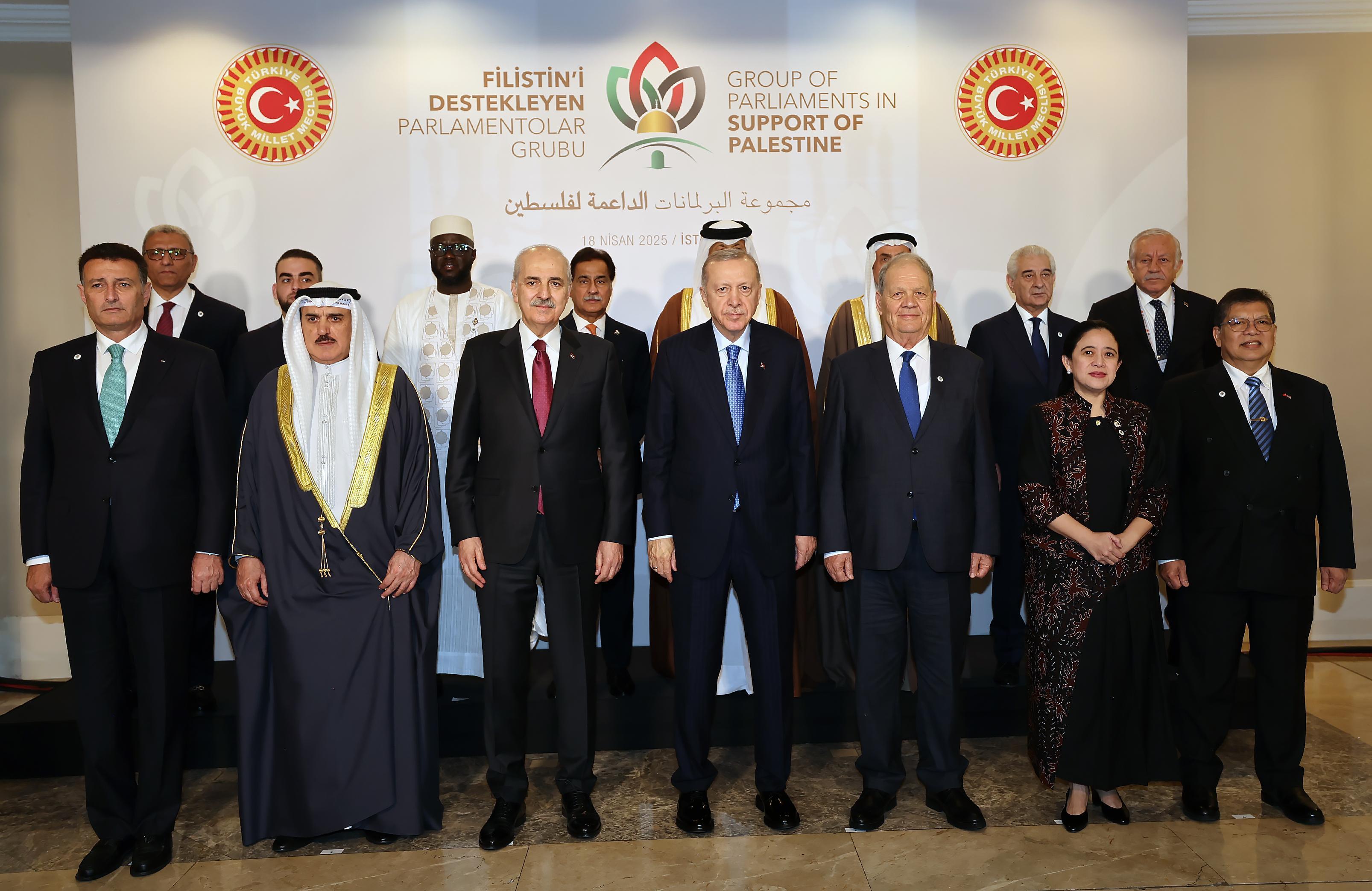 Cumhurbaşkanı Recep Tayyip Erdoğan, “Filistin'i destekleyen parlamentolar grubunun her bir mensubuna yürekten teşekkür ediyorum. Toplantınızın ve alacağınız kararların Filistin için hayırlara vesile olmasını Rabbimden niyaz ediyorum. Yine bu vesileyle sizlerin şahsında, Filistin davasını kendi meselesi görüp destek veren tüm parlamenterlere buradan teşekkürlerimi yolluyorum. Bizden önce yapılan konuşmaları büyük bir ilgiyle takip ettik. Her iki meclis başkanımızı, verdikleri çok önemli mesajlar dolayısıyla ayrı ayrı tebrik ediyorum. Burada şu gerçeği tekrar hatırlatmak isterim: Filistin davasını savunmak, sadece mazlum bir halkı savunmak değildir; Filistin'i savunmak, insanlığı, barışı ve adaleti savunmaktır. Filistin davası, yaklaşık bir asırdır her türlü zulme, barbarlığa ve katliama maruz kalmış bir halkın haysiyet davasıdır. Tüm bunlarla birlikte Filistin davası, özü itibarıyla insan olma, insan kalma mücadelesidir. Müslümanların yanı sıra vicdan sahibi her insanın meselesidir. Elbette bu dava, siyasetin de ötesinde bir vicdan meselesidir" diye konuştu.
