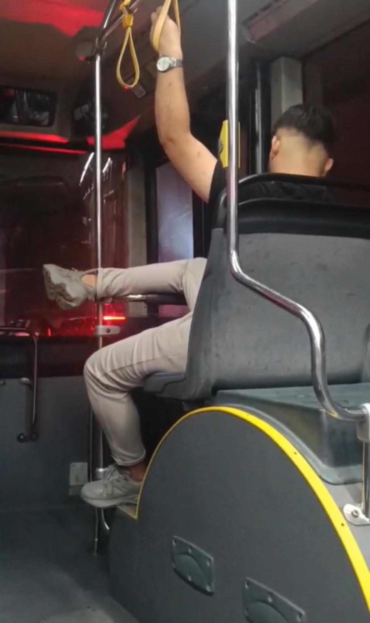 Sultangazi'de iki farklı İETT otobüsünde çekilen görüntülerde, toplu taşıma araçlarındaki hijyen ve saygı kurallarının ihlal edildiğini ortaya koydu. Görüntülerde, bir yolcu, otobüs içinde ayakkabısıyla birlikte ayağını önündeki tutunma borusuna dayarken, başka bir yolcunun ise çıplak ayağını cam kenarındaki tutunma borusuna uzattığı görüldü. Yolcuların, kurallara aykırı bu davranışları diğer yolcuların rahatsızlığına yol açtı. (DHA)