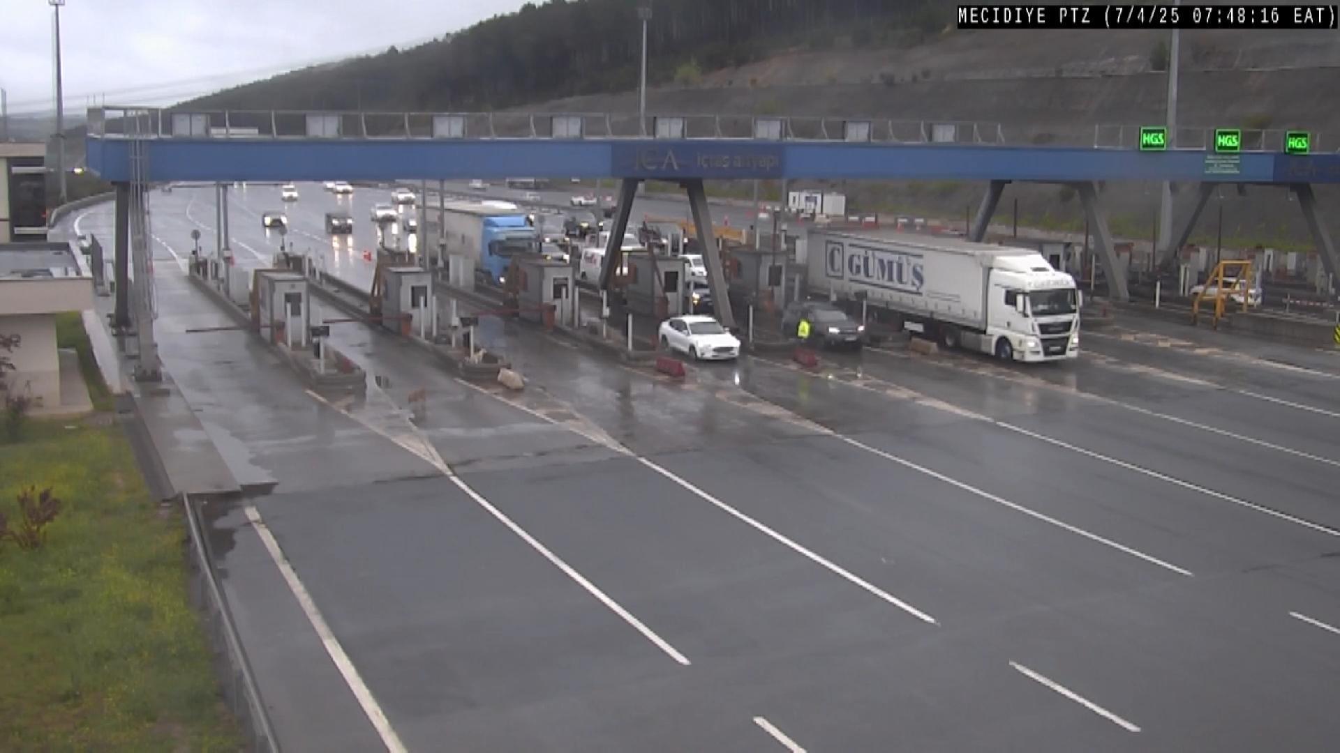 Pendik Kuzey Marmara Otoyolu Mecidiye gişelerinde meydana gelen kazada, Özcan Tunalı idaresindeki 59 FG 562 plakalı TIR'ın ödeme yapmak için yavaşladığı sırada gişelere doğru ilerleyen 34 HMN 436 plakalı hafif ticari araç TIR'a arkadan çarptı. Kazada 31 yaşındaki sürücüsü Cihat Duman hayatını kaybetti. Kaza anına ilişkin güvenlik kamera görüntüleri ortaya çıktı. Görüntülerde, TIR'ın ödeme yapmak için gişelere girdiği sırada hızla gelen aracın arkadan çarptığı görülüyor. (DHA)