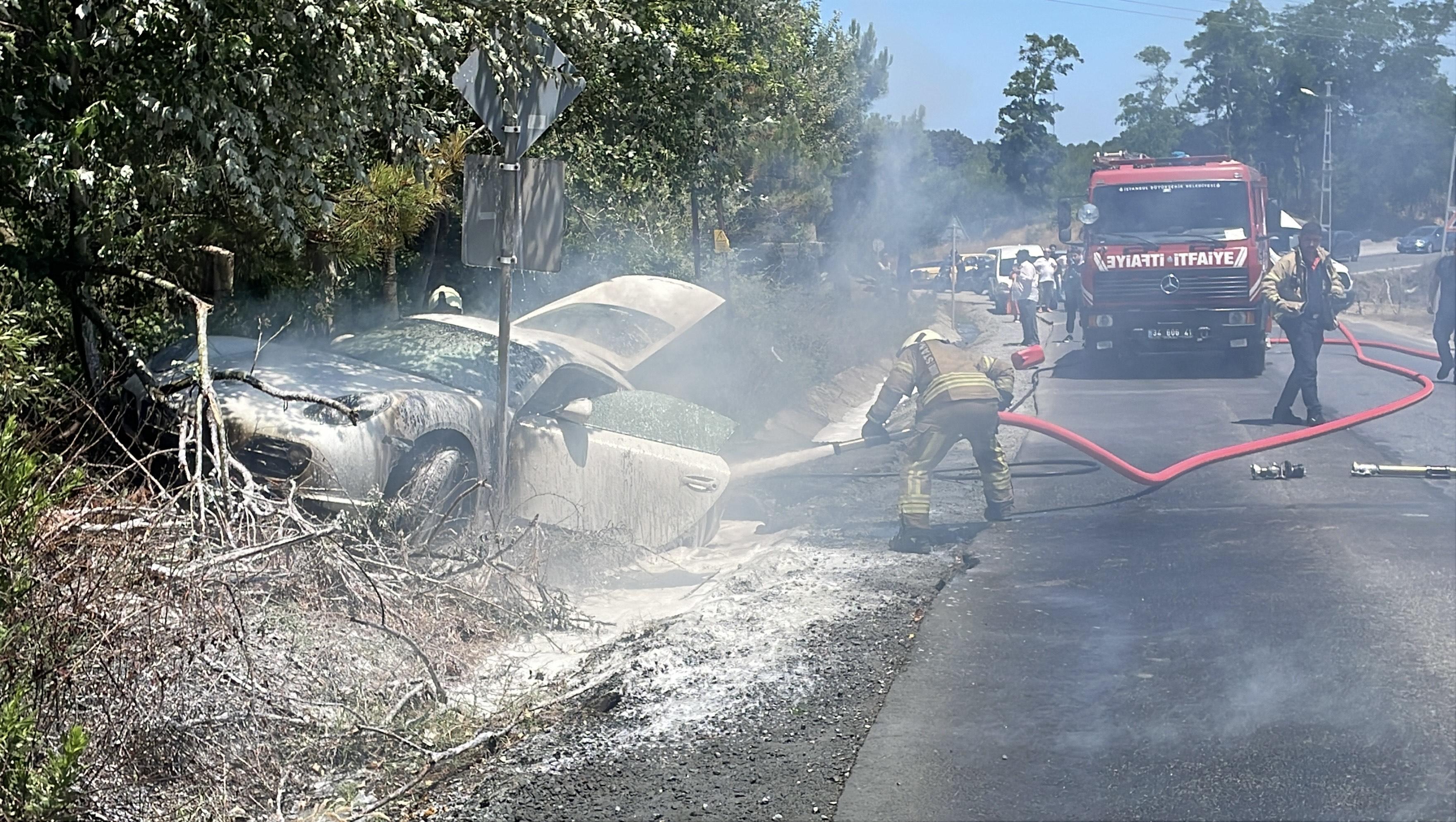 Olay saat 13.00 sıralarında Uskumruköy Mahallesi Uskumruköy Caddesi üzerinde meydana geldi. Cadde üzerinde seyir halinde olan 06 AV 3760 plakalı lüks otomobil, sürücüsü Uğur D.'nin direksiyon hakimiyetini kaybetmesi üzerine yol kenarındaki ağaçların arasına savruldu. Sürücü araçtan kendi imkanlarıyla çıkarken, otomobilde yangın çıktı. Ağaçlara da sıçrayan yangın, sürücünün ihbarı üzerine bölgeye gelen itfaiye ekipleri tarafından söndürüldü. Yangın sonrasında otomobil kullanılamaz hale geldi. Olayla ilgili soruşturma başlatıldı. (DHA)