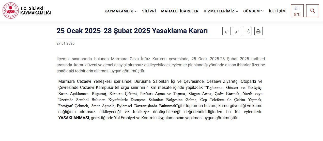 Uğur Samet AVCI / İSTANBUL,(DHA) - SİLİVRİ Kaymakamlığı tarafından yapılan duyuruda, 25 Ocak ile 28 Şubat tarihleri arasında Marmara Ceza İnfaz Kurumu Yerleşkesi'ne 1 kilometre mesafe içerisinde yapılacak toplantı, gösteri yürüyüşü ve basın açıklaması gibi tüm eylemler yasaklandı.